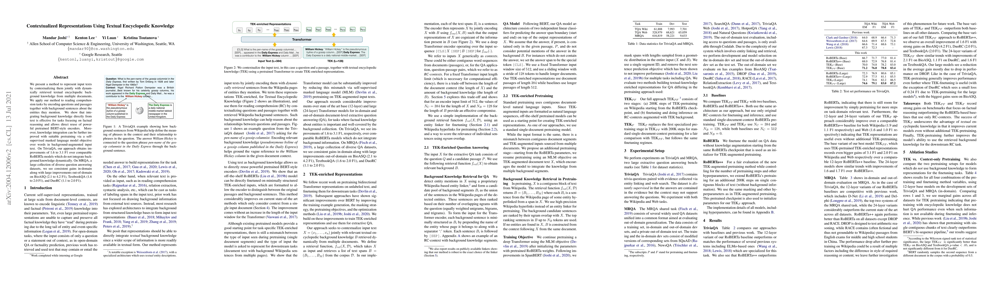 Researchers developed a method to integrate textual encyclopedic knowledge into reading comprehension tasks, achieving significant improvements over comparable models on multiple datasets.