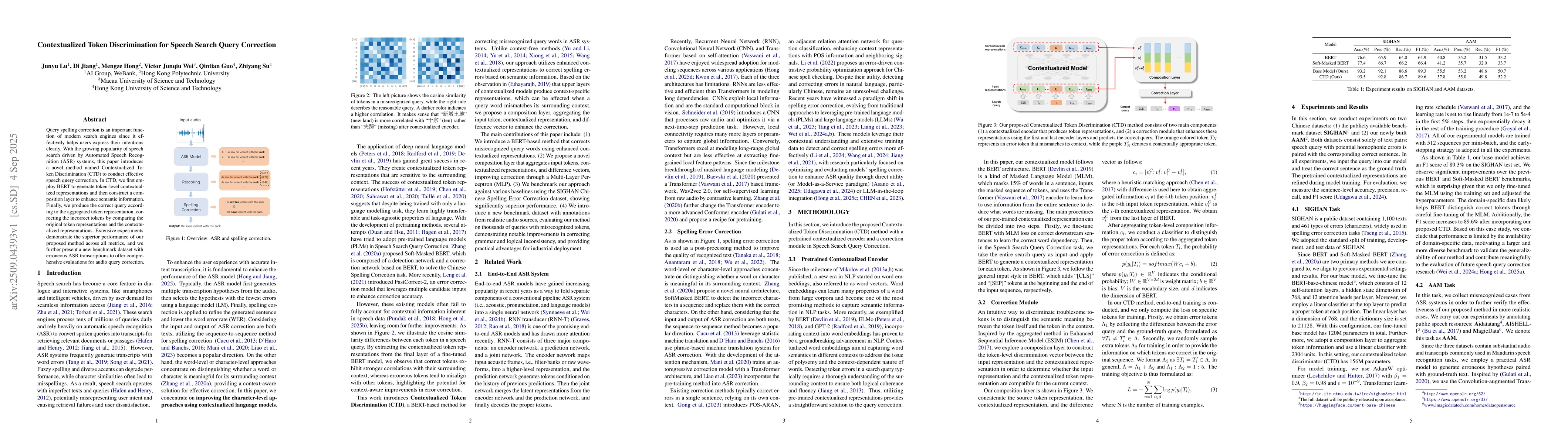 Query spelling correction is an important function of modern search engines since it effectively helps users express their intentions clearly. With the growing popularity of speech search driven by Automated Speech Recognition (ASR) systems, this paper introduces a novel method named Contextualized Token Discrimination (CTD) to conduct effective speech query correction. In CTD, we first employ BERT to generate token-level contextualized representations and then construct a composition layer to enhance semantic information. Finally, we produce the correct query according to the aggregated token representation, correcting the incorrect tokens by comparing the original token representations and the contextualized representations. Extensive experiments demonstrate the superior performance of our proposed method across all metrics, and we further present a new benchmark dataset with erroneous ASR transcriptions to offer comprehensive evaluations for audio query correction.