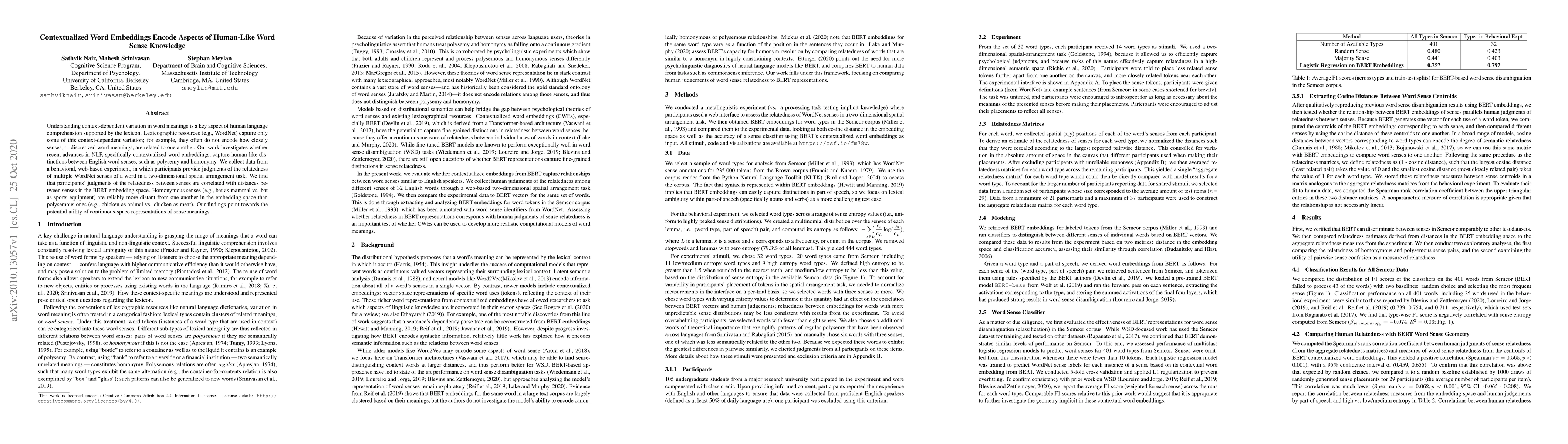 The findings suggest that contextualized word embeddings can capture human-like distinctions between English word senses, potentially augmenting lexicographic resources like WordNet with a continuous measure of sense relatedness.