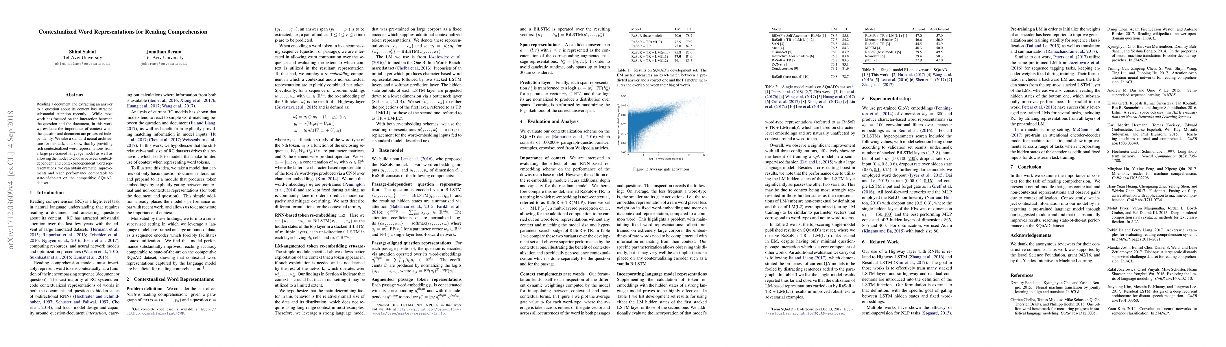 This paper explores the importance of context in reading comprehension using contextualized word representations from a large pre-trained language model. It shows significant improvements and comparable performance to state-of-the-art methods on the SQuAD dataset.