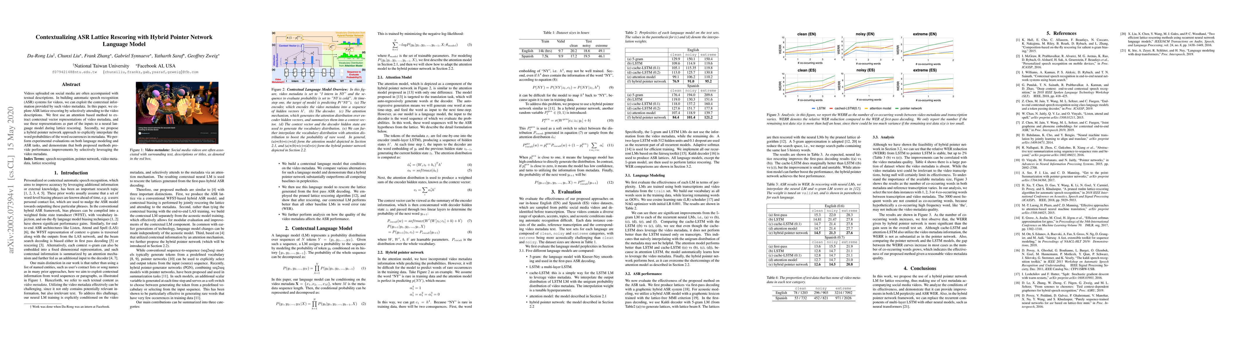 This paper investigates ASR lattice rescoring using contextual information from video metadata to enhance recognition accuracy. It employs an attention-based method to extract metadata representations and integrates them into a neural language model during rescoring. Additionally, a hybrid pointer network is proposed to interpolate word probabilities from metadata, showing improved performance in both language modeling and ASR tasks.