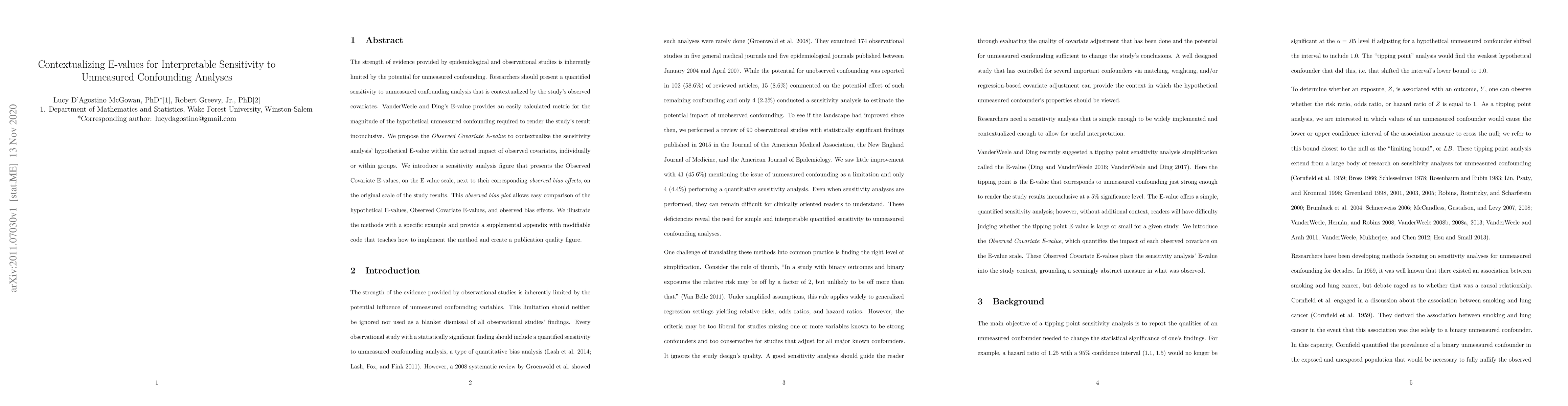 This paper proposes the Observed Covariate E-value to contextualize sensitivity analyses for unmeasured confounding in observational studies, comparing hypothetical E-values against the actual impact of observed covariates. It introduces a visual sensitivity analysis figure to facilitate easy comparison of these values.