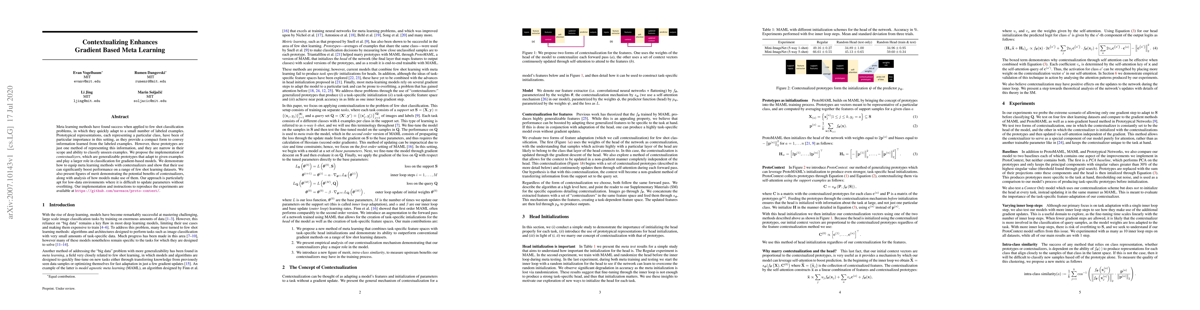 A new approach to meta learning for few-shot classification uses contextualizers, which adapt to given examples and improve performance on low-data environments. This method outperforms traditional methods in several datasets.