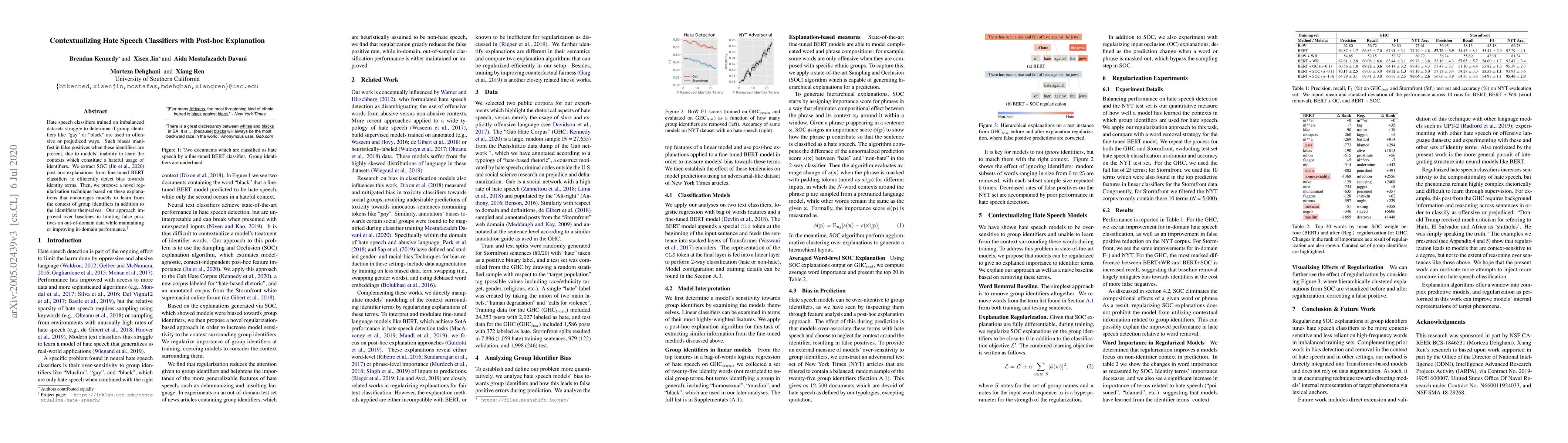 This paper addresses the issue of bias in hate speech classifiers by extracting post-hoc explanations from fine-tuned BERT models to identify contextual misuse of identity terms. It introduces a novel regularization technique that enhances model learning from context, resulting in better performance in reducing false positives on out-of-domain data while maintaining in-domain accuracy.
