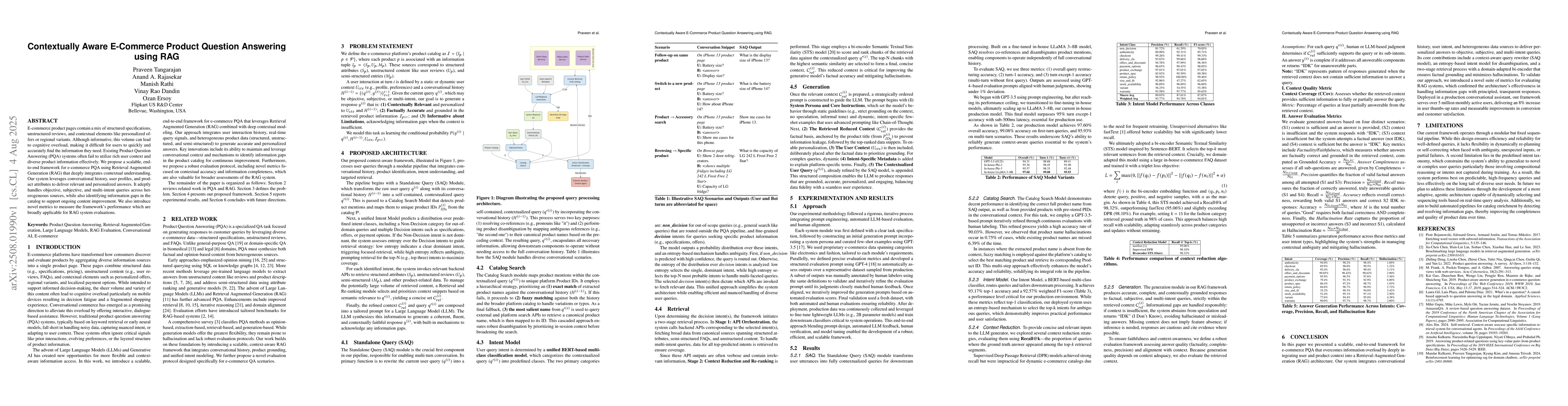 E-commerce product pages contain a mix of structured specifications, unstructured reviews, and contextual elements like personalized offers or regional variants. Although informative, this volume can lead to cognitive overload, making it difficult for users to quickly and accurately find the information they need. Existing Product Question Answering (PQA) systems often fail to utilize rich user context and diverse product information effectively. We propose a scalable, end-to-end framework for e-commerce PQA using Retrieval Augmented Generation (RAG) that deeply integrates contextual understanding. Our system leverages conversational history, user profiles, and product attributes to deliver relevant and personalized answers. It adeptly handles objective, subjective, and multi-intent queries across heterogeneous sources, while also identifying information gaps in the catalog to support ongoing content improvement. We also introduce novel metrics to measure the framework's performance which are broadly applicable for RAG system evaluations.