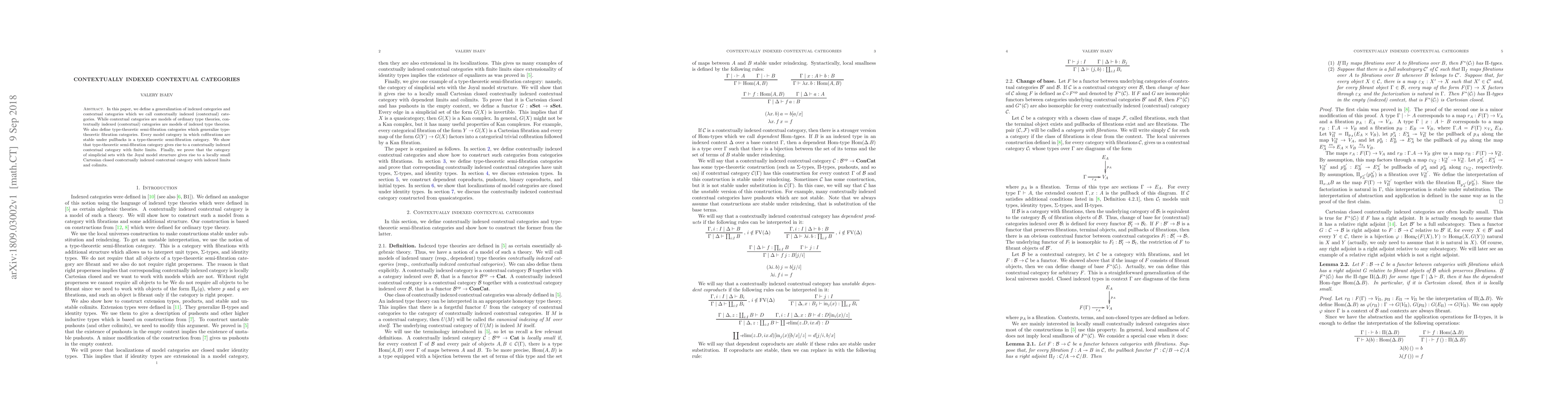 This paper introduces contextually indexed categories, a generalization of contextual categories, which model indexed type theories. It also defines type-theoretic semi-fibration categories and proves that these categories yield contextually indexed contextual categories with finite limits, exemplified by the category of simplicial sets with the Joyal model structure.