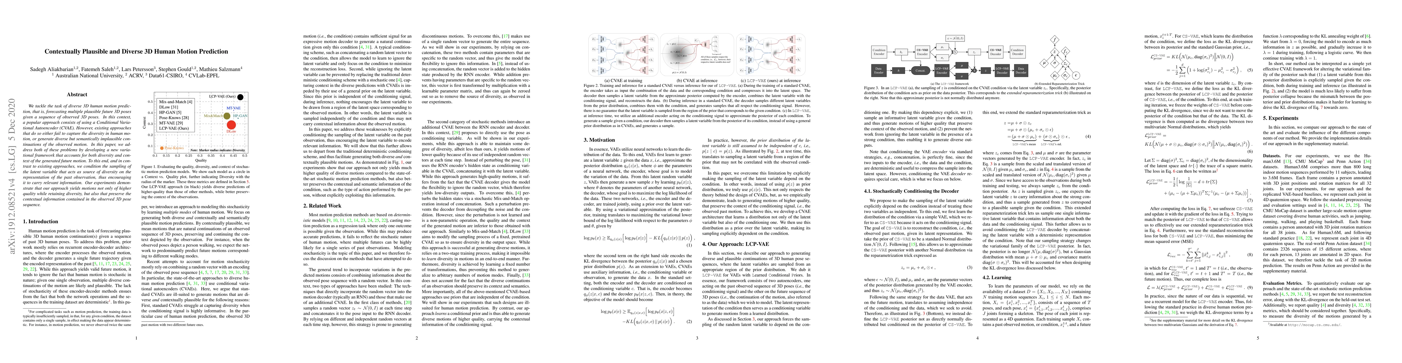 This paper proposes a new variational framework for diverse and contextually plausible 3D human motion prediction, addressing the limitations of existing CVAE-based methods by conditioning the latent variable on past observations to enhance contextual relevance and diversity. Experimental results show improved quality and contextual preservation in the predicted motions.