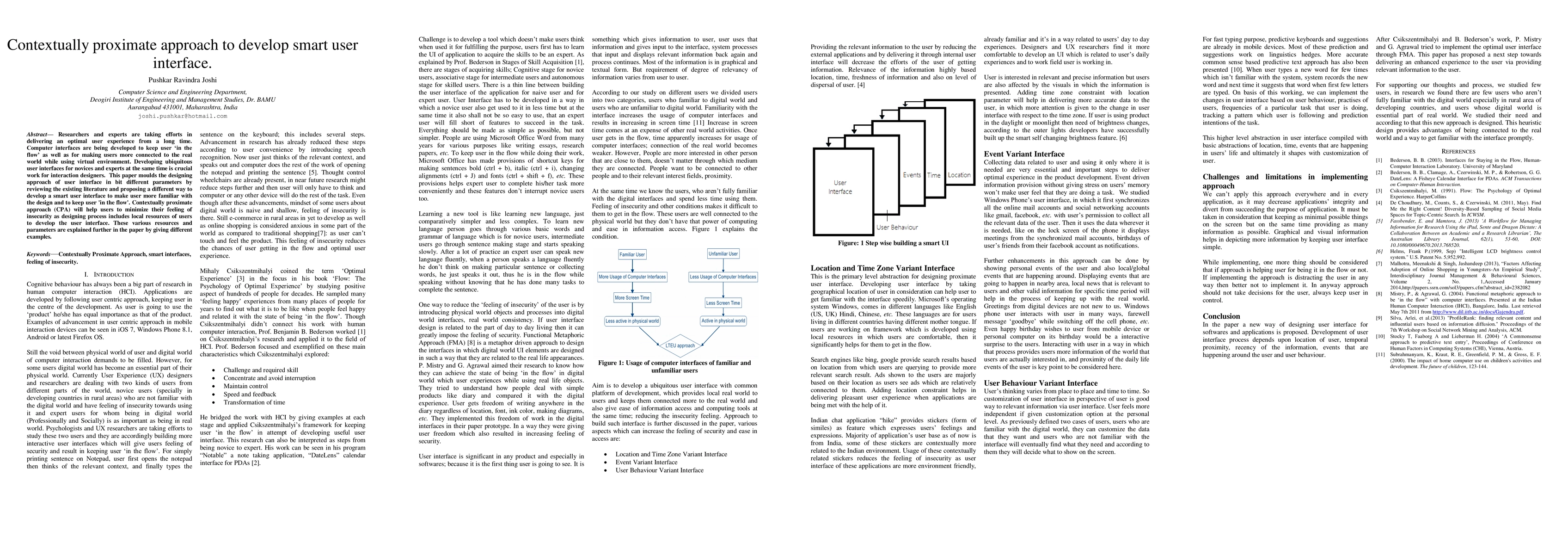 Researchers and experts are taking efforts in delivering an optimal user experience from a long time. Computer interfaces are being developed to keep user 'in the flow' as well as for making users more connected to the real world wile using virtual environment. Developing ubiquitous user interfaces for novices and experts at the same time is crucial work for interaction designers. This paper molds the designing approach of user interfaces in bit different parameters by reviewing the existing literature and proposing a different way to develop a smart user interface to make user more familiar with the design and to keep user 'in the flow'. Contextually proximate approach (CPA) will help users to minimize their feeling of insecurity as designing process includes local resources of users to develop the user interfaces. These various resources and parameters are explained further in the paper by giving different examples.
