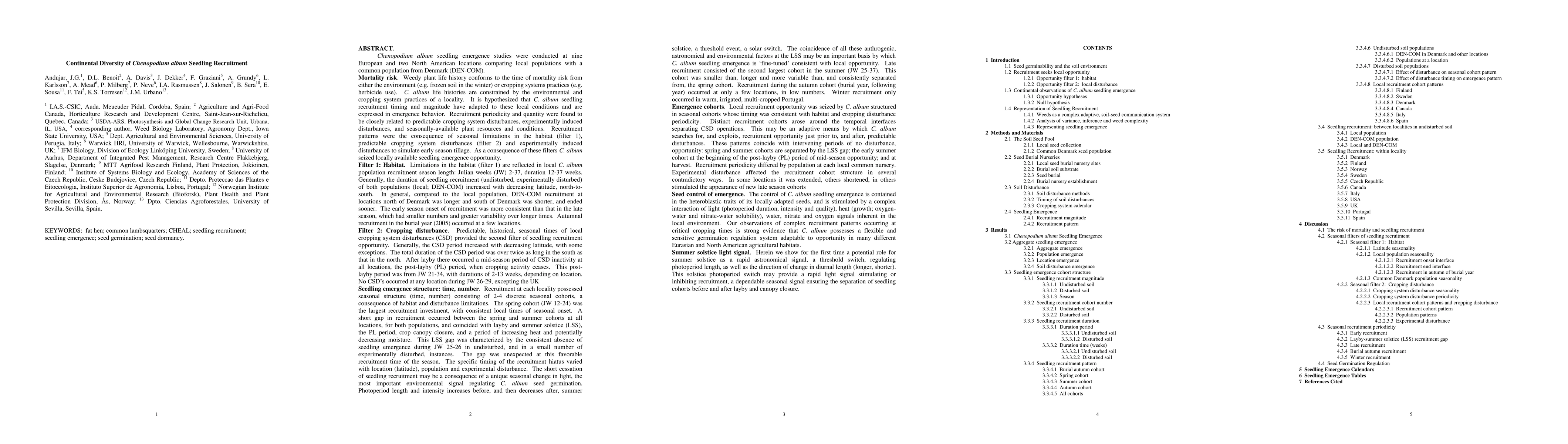 Chenopodium album seedling emergence studies were conducted at nine European and two North American locations comparing local populations with a common population from Denmark. It is hypothesized that C. album seedling recruitment timing and magnitude have adapted to environmental and cropping system practices of a locality. Limitations in the habitat (filter 1) were reflected in local C. album population recruitment season length. Generally, the duration of seedling recruitment of both populations (local; DEN-COM) increased with decreasing latitude, north-to-south. In general, compared to the local population, DEN-COM recruitment at locations north of Denmark was longer and south of Denmark was shorter, and ended sooner. Generally, the local cropping system disturbances (CSD) period increased with decreasing latitude. The total duration of the CSD period was over twice as long in the south as that in the north. Recruitment at each locality possessed seasonal structure (time, number) consisting of 2-4 discrete seasonal cohorts. This may be an adaptive means by which C. album searches for, and exploits, recruitment opportunity just prior to, and after, predictable disturbances. The control of C. album seedling emergence is contained in the heteroblastic traits of its locally adapted seeds, and is stimulated by a complex interaction of light, heat, water, nitrate and oxygen signals inherent in the local environment. Our observations of complex recruitment patterns occurring at critical cropping times is strong evidence that C. album possesses a flexible and sensitive germination regulation system adaptable to opportunity in many different Eurasian and North American agricultural habitats.