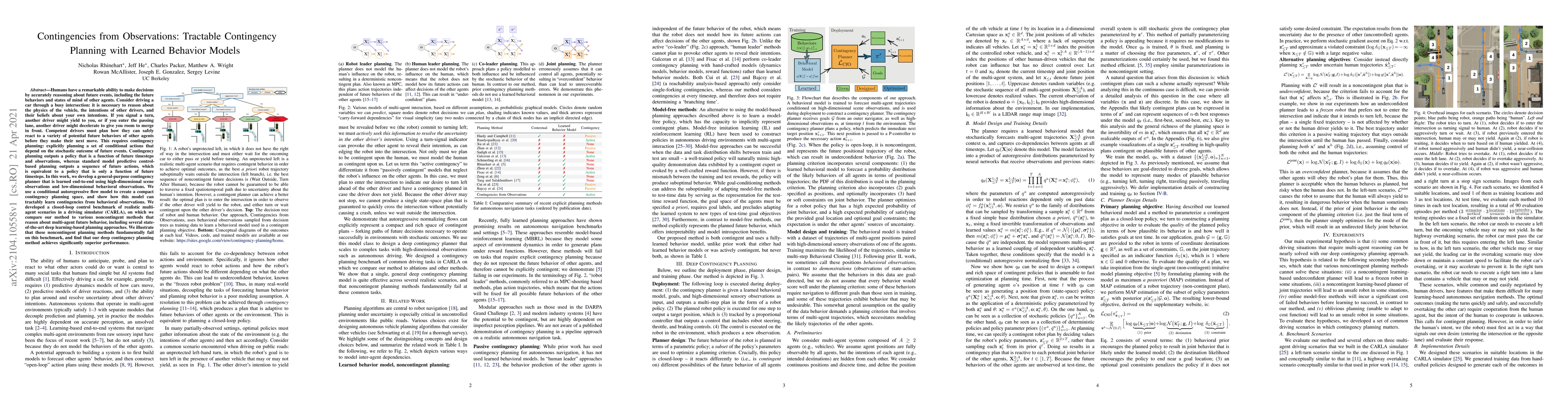 Humans have a remarkable ability to make decisions by accurately reasoning about future events, including the future behaviors and states of mind of other agents. Consider driving a car through a busy intersection: it is necessary to reason about the physics of the vehicle, the intentions of other drivers, and their beliefs about your own intentions. If you signal a turn, another driver might yield to you, or if you enter the passing lane, another driver might decelerate to give you room to merge in front. Competent drivers must plan how they can safely react to a variety of potential future behaviors of other agents before they make their next move. This requires contingency planning: explicitly planning a set of conditional actions that depend on the stochastic outcome of future events. In this work, we develop a general-purpose contingency planner that is learned end-to-end using high-dimensional scene observations and low-dimensional behavioral observations. We use a conditional autoregressive flow model to create a compact contingency planning space, and show how this model can tractably learn contingencies from behavioral observations. We developed a closed-loop control benchmark of realistic multi-agent scenarios in a driving simulator (CARLA), on which we compare our method to various noncontingent methods that reason about multi-agent future behavior, including several state-of-the-art deep learning-based planning approaches. We illustrate that these noncontingent planning methods fundamentally fail on this benchmark, and find that our deep contingency planning method achieves significantly superior performance. Code to run our benchmark and reproduce our results is available at https://sites.google.com/view/contingency-planning