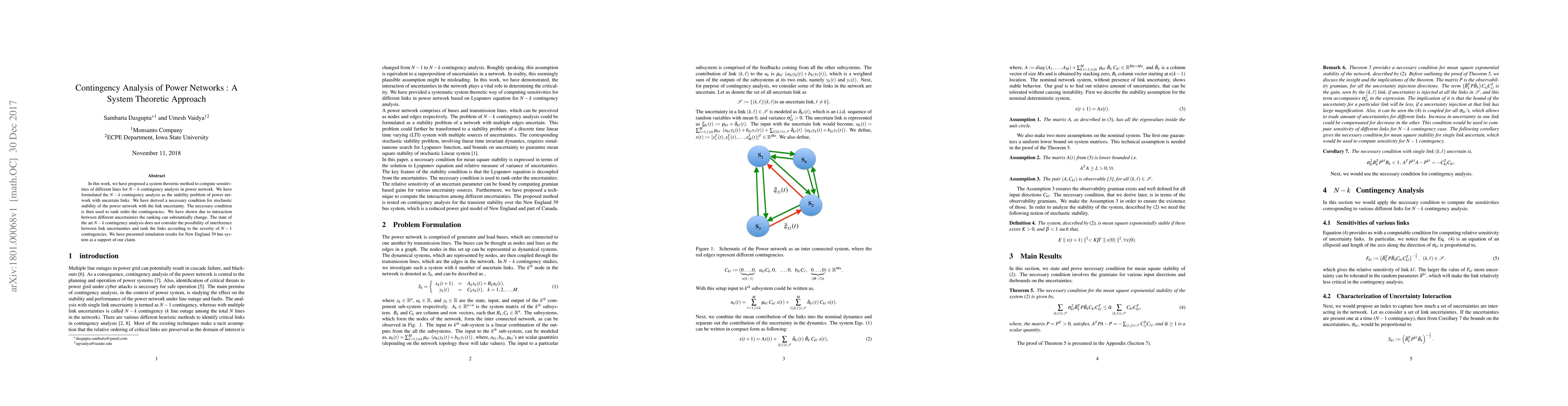 This paper proposes a system theoretic method for $N-k$ contingency analysis in power networks, considering interactions between different uncertainties. The method ranks contingencies based on stochastic stability, showing that traditional $N-1$ analysis may not fully capture the severity due to interference between uncertainties.