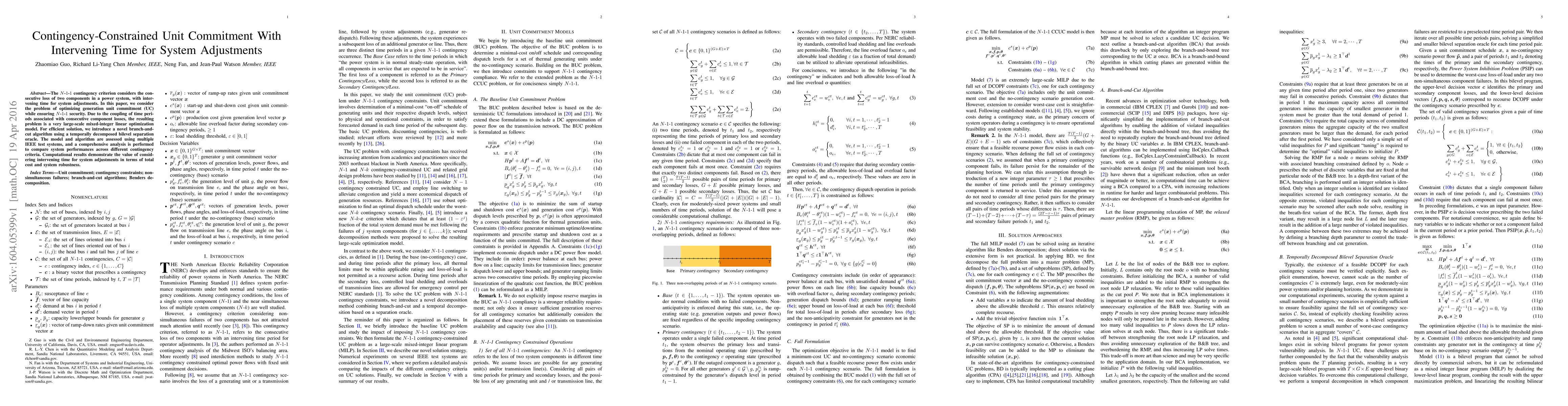 This paper optimizes generation unit commitment under the N-1-1 contingency criterion, which considers the loss of two components with intervening time for adjustments. A new branch-and-cut algorithm is introduced to solve the large-scale mixed-integer linear optimization model, demonstrating improved total cost and system robustness compared to other criteria.