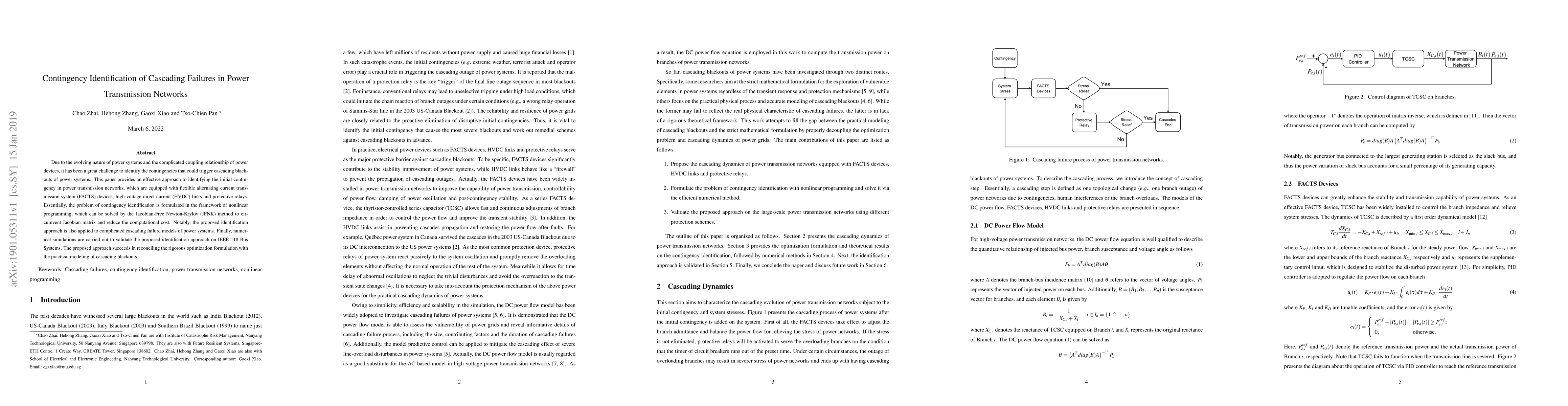 Due to the evolving nature of power systems and the complicated coupling relationship of power devices, it has been a great challenge to identify the contingencies that could trigger cascading blackouts of power systems. This paper provides an effective approach to identifying the initial contingency in power transmission networks, which are equipped with flexible alternating current transmission system (FACTS) devices, high-voltage direct current (HVDC) links and protective relays. Essentially, the problem of contingency identification is formulated in the framework of nonlinear programming, which can be solved by the Jacobian-Free Newton-Krylov (JFNK) method to circumvent the Jacobian matrix and reduce the computational cost. Notably, the proposed identification approach is also applied to complicated cascading failure models of power systems. Finally, numerical simulations are carried out to validate the proposed identification approach on IEEE 118 Bus Systems. The proposed approach succeeds in reconciling the rigorous optimization formulation with the practical modelling of cascading blackouts.