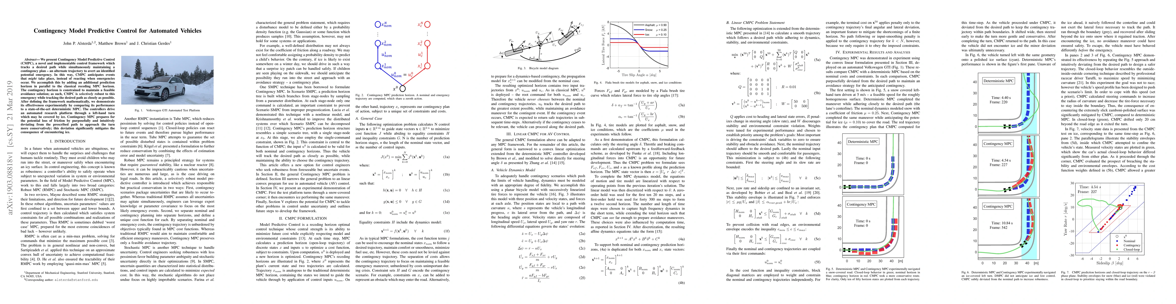 We present Contingency Model Predictive Control (CMPC), a novel and implementable control framework which tracks a desired path while simultaneously maintaining a contingency plan -- an alternate trajectory to avert an identified potential emergency. In this way, CMPC anticipates events that might take place, instead of reacting when emergencies occur. We accomplish this by adding an additional prediction horizon in parallel to the classical receding MPC horizon. The contingency horizon is constrained to maintain a feasible avoidance solution; as such, CMPC is selectively robust to this emergency while tracking the desired path as closely as possible. After defining the framework mathematically, we demonstrate its effectiveness experimentally by comparing its performance to a state-of-the-art deterministic MPC. The controllers drive an automated research platform through a left-hand turn which may be covered by ice. Contingency MPC prepares for the potential loss of friction by purposefully and intuitively deviating from the prescribed path to approach the turn more conservatively; this deviation significantly mitigates the consequence of encountering ice.