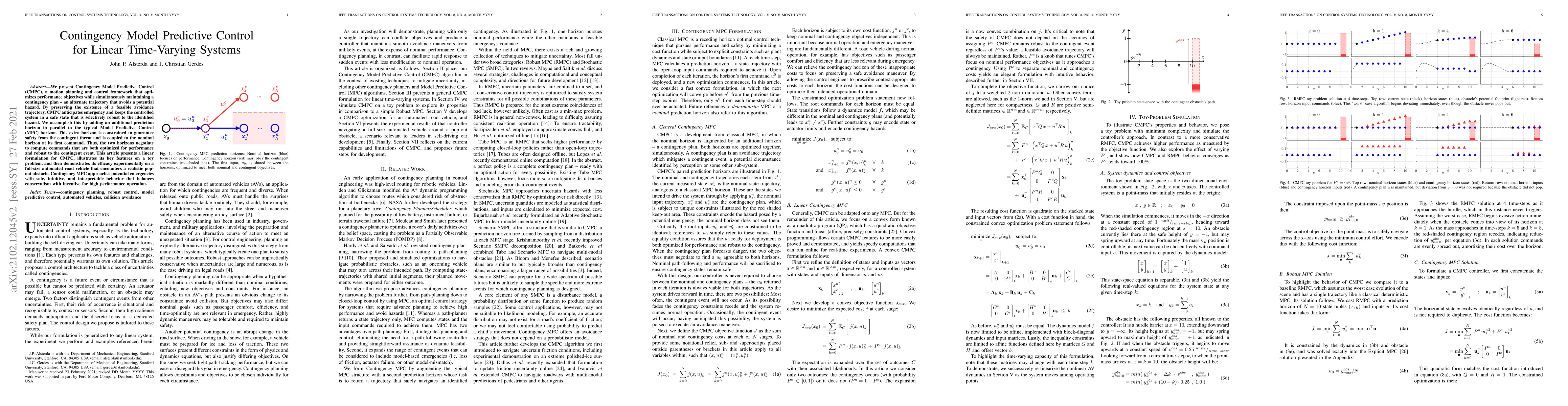 We present Contingency Model Predictive Control (CMPC), a motion planning and control framework that optimizes performance objectives while simultaneously maintaining a contingency plan -- an alternate trajectory that avoids a potential hazard. By preserving the existence of a feasible avoidance trajectory, CMPC anticipates emergency and keeps the controlled system in a safe state that is selectively robust to the identified hazard. We accomplish this by adding an additional prediction horizon in parallel to the typical Model Predictive Control (MPC) horizon. This extra horizon is constrained to guarantee safety from the contingent threat and is coupled to the nominal horizon at its first command. Thus, the two horizons negotiate to compute commands that are both optimized for performance and robust to the contingent event. This article presents a linear formulation for CMPC, illustrates its key features on a toy problem, and then demonstrates its efficacy experimentally on a full-size automated road vehicle that encounters a realistic pop-out obstacle. Contingency MPC approaches potential emergencies with safe, intuitive, and interpretable behavior that balances conservatism with incentive for high performance operation.