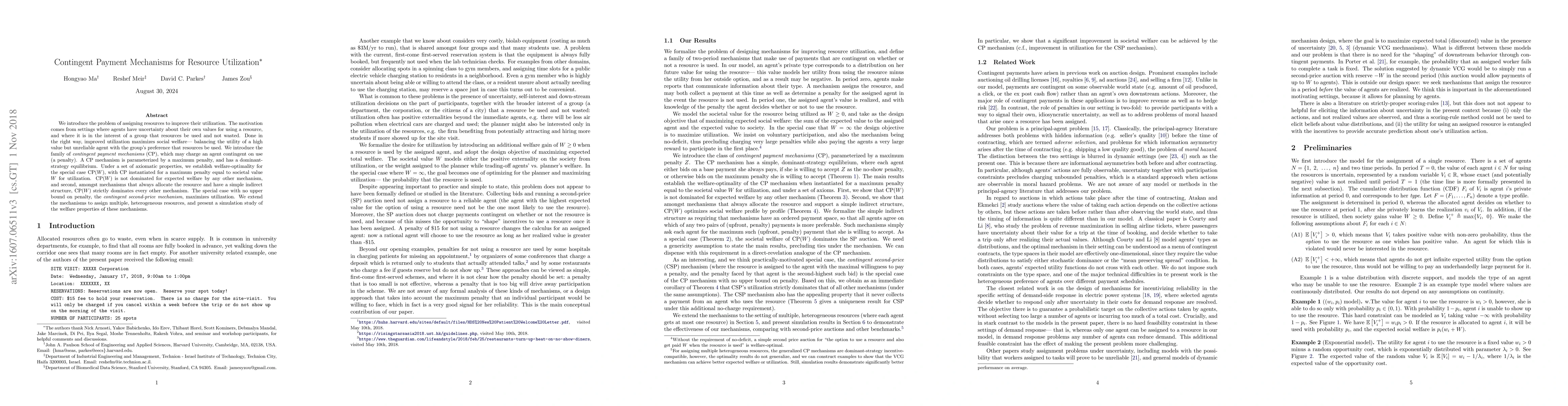 This paper proposes contingent payment mechanisms (CP) to optimize resource utilization when agents have uncertain value assessments. The CP(W) mechanism, with a maximum penalty equal to societal value W, is shown to be welfare-optimal and dominates other mechanisms in maximizing resource use while balancing individual and group interests.