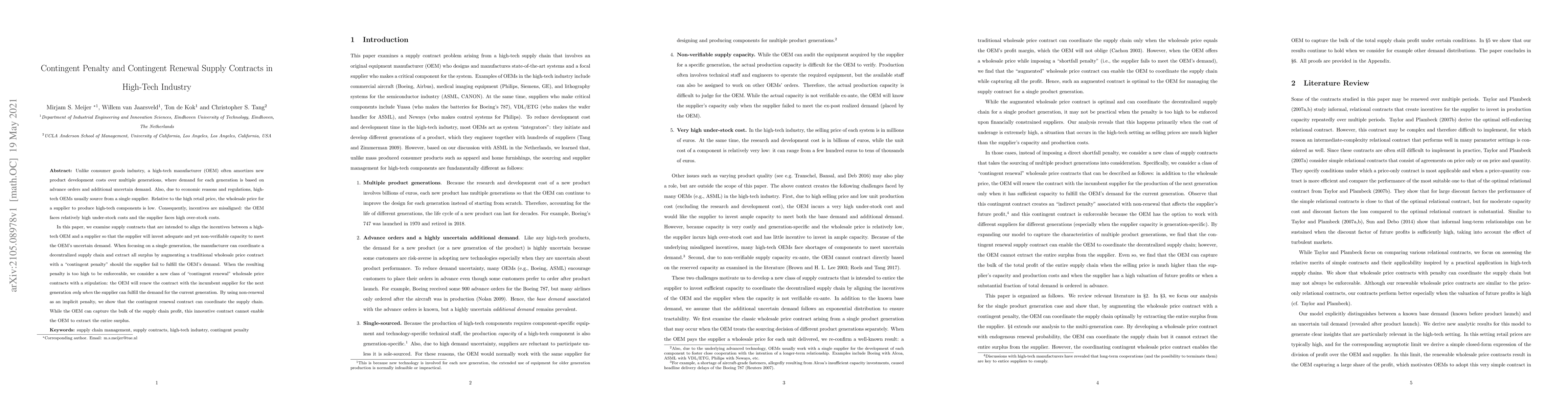 This paper explores supply contracts for high-tech manufacturers to align incentives between OEMs and single suppliers, focusing on "contingent penalty" and "contingent renewal" contracts. The contingent penalty contract can coordinate a supply chain but may not be enforceable at high levels, leading to the introduction of contingent renewal contracts that use non-renewal as a penalty to meet demand uncertainties.