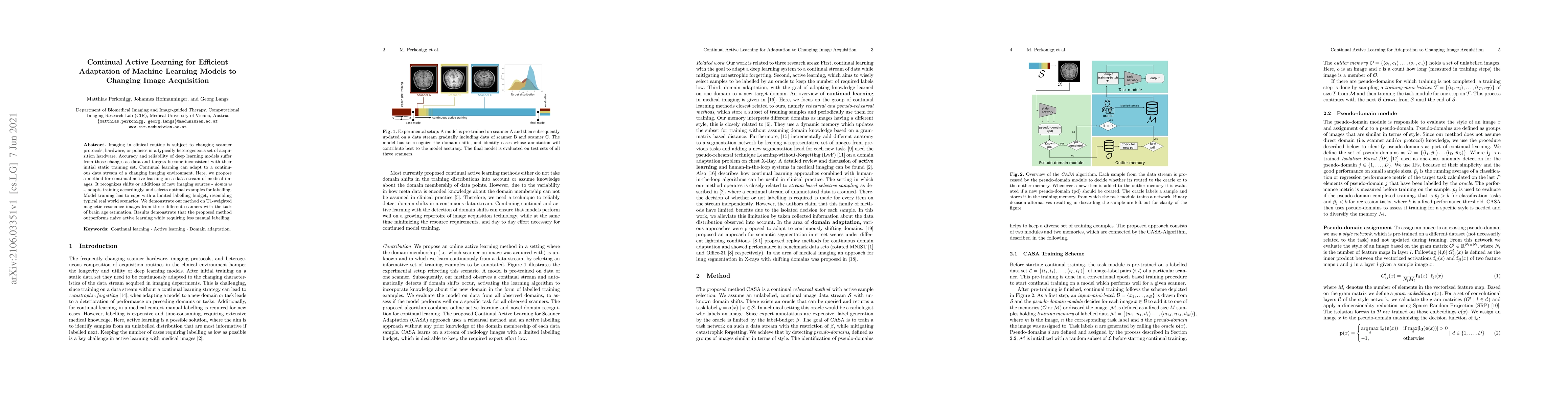 Imaging in clinical routine is subject to changing scanner protocols, hardware, or policies in a typically heterogeneous set of acquisition hardware. Accuracy and reliability of deep learning models suffer from those changes as data and targets become inconsistent with their initial static training set. Continual learning can adapt to a continuous data stream of a changing imaging environment. Here, we propose a method for continual active learning on a data stream of medical images. It recognizes shifts or additions of new imaging sources - domains -, adapts training accordingly, and selects optimal examples for labelling. Model training has to cope with a limited labelling budget, resembling typical real world scenarios. We demonstrate our method on T1-weighted magnetic resonance images from three different scanners with the task of brain age estimation. Results demonstrate that the proposed method outperforms naive active learning while requiring less manual labelling.