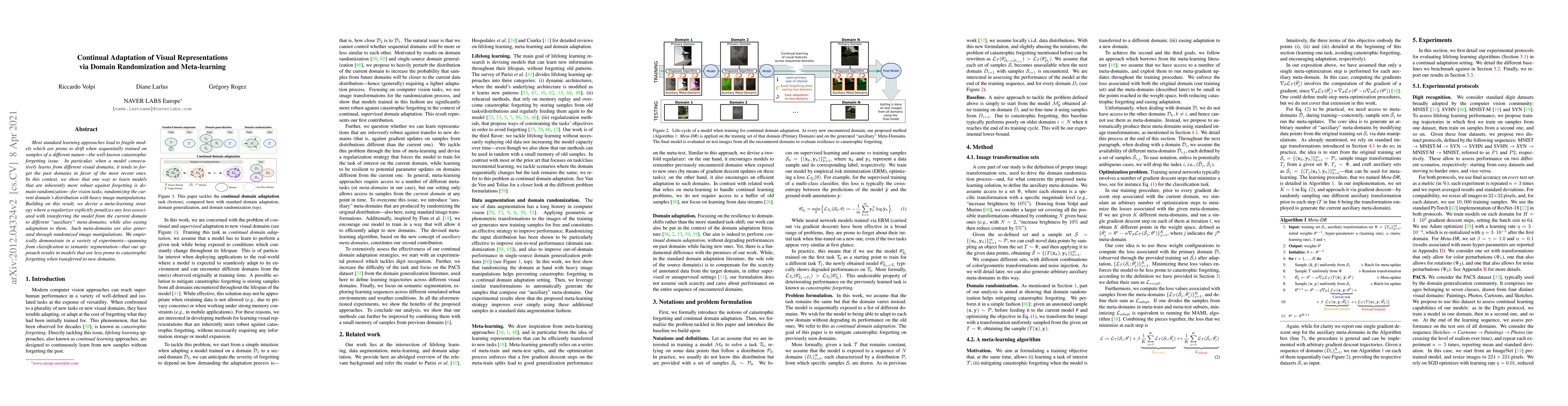 This paper proposes a method combining domain randomization and meta-learning to create robust visual models that adapt continually without suffering from catastrophic forgetting when exposed to new domains. The approach uses randomized image manipulations to generate auxiliary meta-domains, which help in reducing forgetting and improving adaptation to new visual domains.