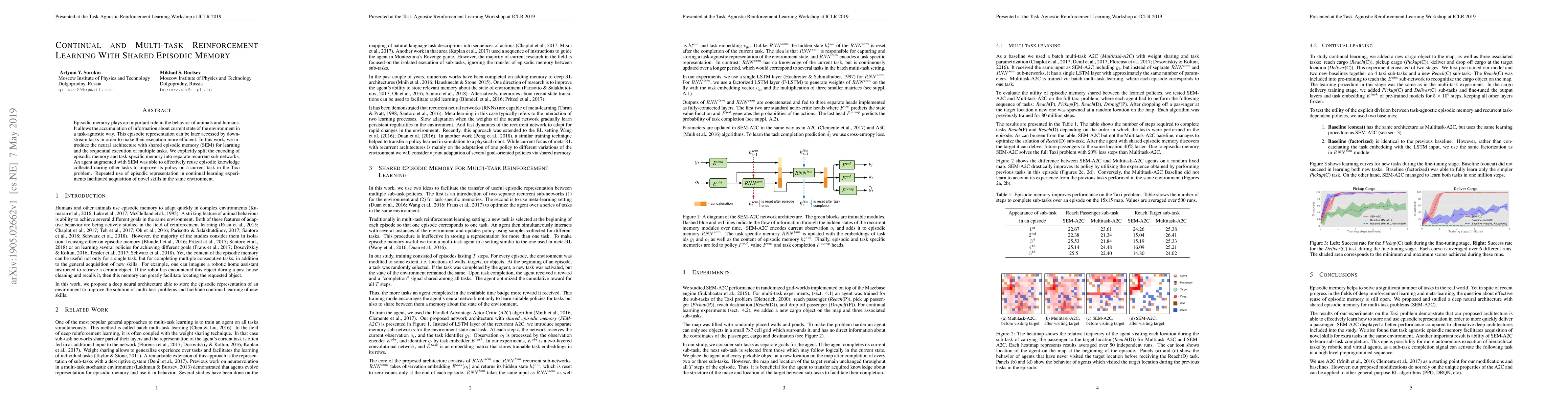 This paper proposes a neural architecture with shared episodic memory (SEM) to enhance continual and multi-task reinforcement learning. The SEM allows an agent to reuse knowledge from previous tasks, improving performance on current tasks and facilitating the acquisition of new skills in a continual learning setting.