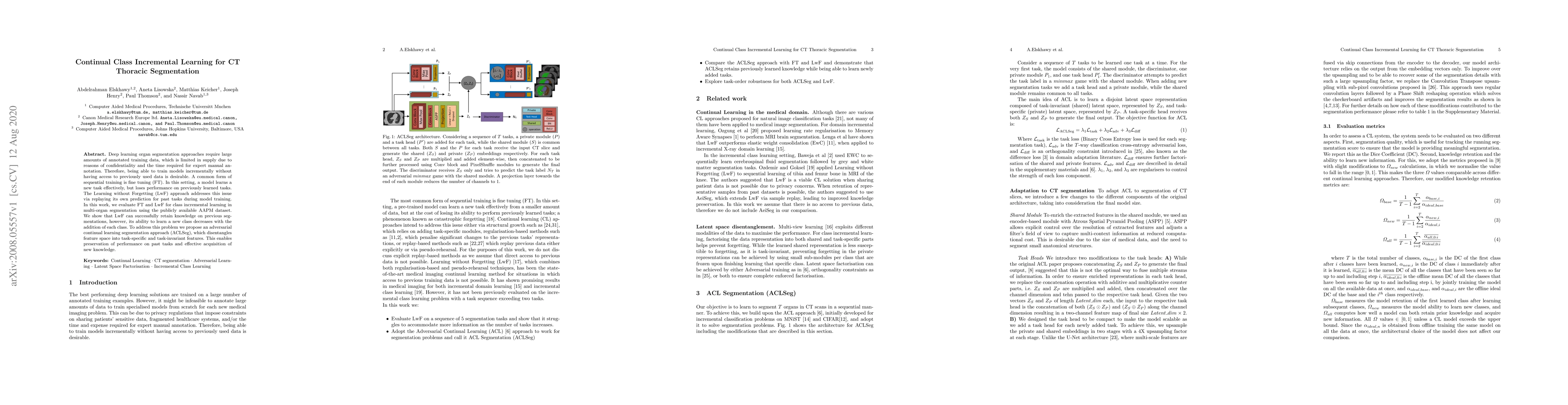 This paper evaluates fine-tuning and Learning without Forgetting (LwF) for class incremental learning in CT thoracic segmentation, finding LwF retains past knowledge but struggles with new classes. The proposed ACLSeg approach disentangles feature space to maintain performance on previous tasks while effectively learning new classes.