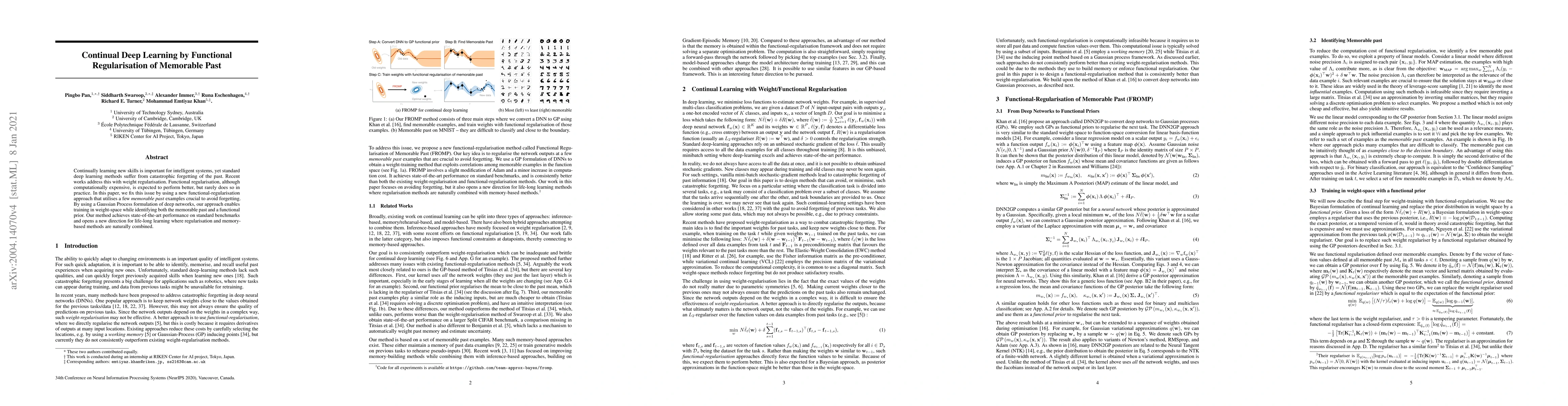 This paper proposes a novel functional-regularisation approach for continual deep learning that leverages Gaussian Processes to identify memorable past examples, thereby mitigating catastrophic forgetting and achieving state-of-the-art performance on benchmarks. The method combines functional priors with memory-based techniques, offering a new direction for life-long learning.