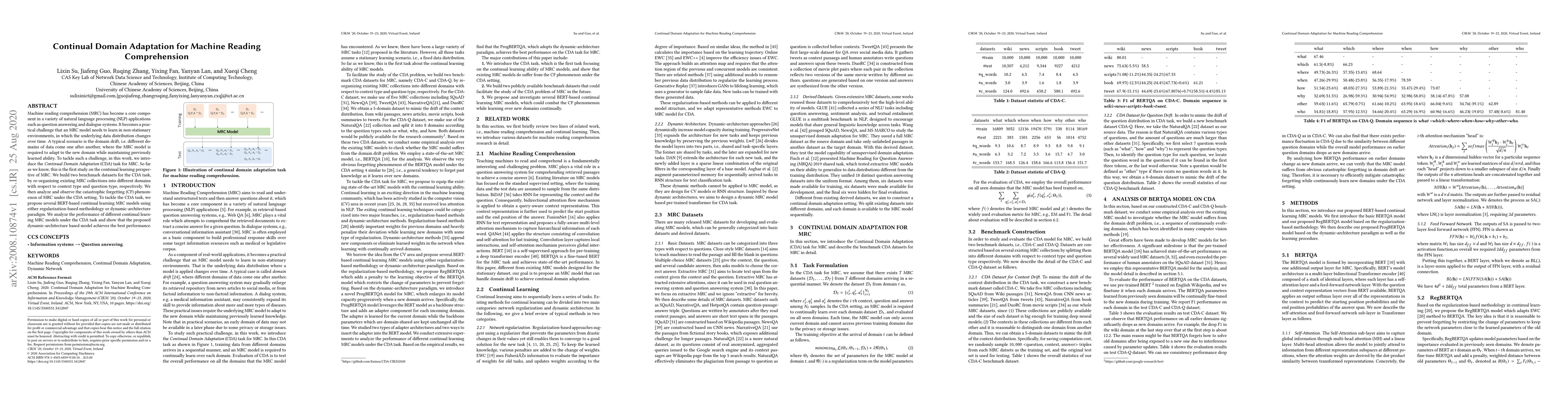 This paper introduces the Continual Domain Adaptation (CDA) task for Machine Reading Comprehension (MRC) to address the challenge of adapting to changing data distributions over time. The authors propose several BERT-based continual learning models to mitigate catastrophic forgetting and demonstrate that a dynamic-architecture based model performs best in the CDA setting.