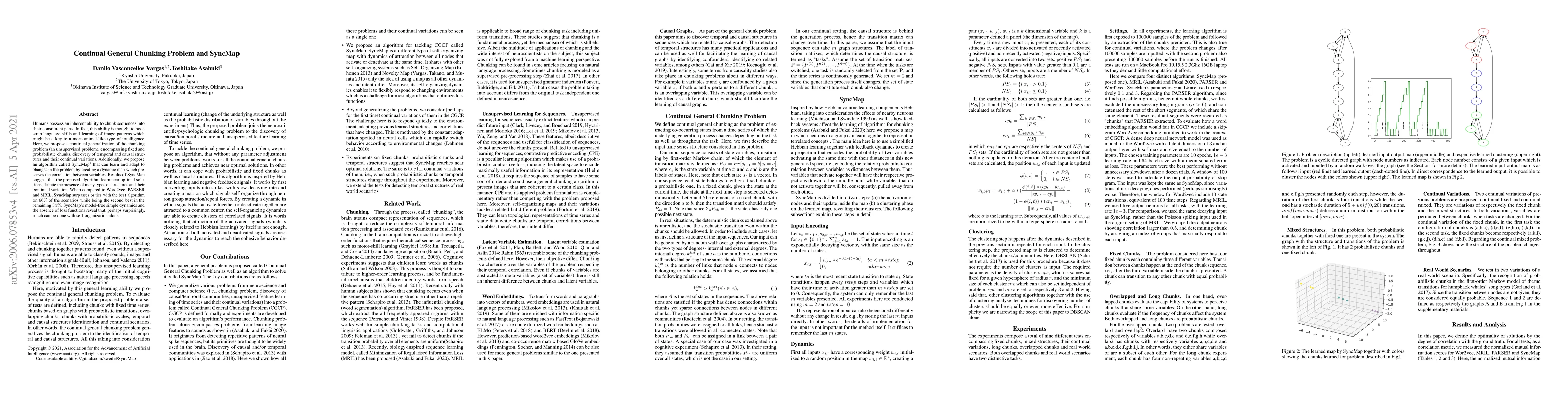 Humans possess an inherent ability to chunk sequences into their constituent parts. In fact, this ability is thought to bootstrap language skills and learning of image patterns which might be a key to a more animal-like type of intelligence. Here, we propose a continual generalization of the chunking problem (an unsupervised problem), encompassing fixed and probabilistic chunks, discovery of temporal and causal structures and their continual variations. Additionally, we propose an algorithm called SyncMap that can learn and adapt to changes in the problem by creating a dynamic map which preserves the correlation between variables. Results of SyncMap suggest that the proposed algorithm learn near optimal solutions, despite the presence of many types of structures and their continual variation. When compared to Word2vec, PARSER and MRIL, SyncMap surpasses or ties with the best algorithm on $66\%$ of the scenarios while being the second best in the remaining $34\%$. SyncMap's model-free simple dynamics and the absence of loss functions reveal that, perhaps surprisingly, much can be done with self-organization alone. Code available at https://github.com/zweifel/SyncMap.