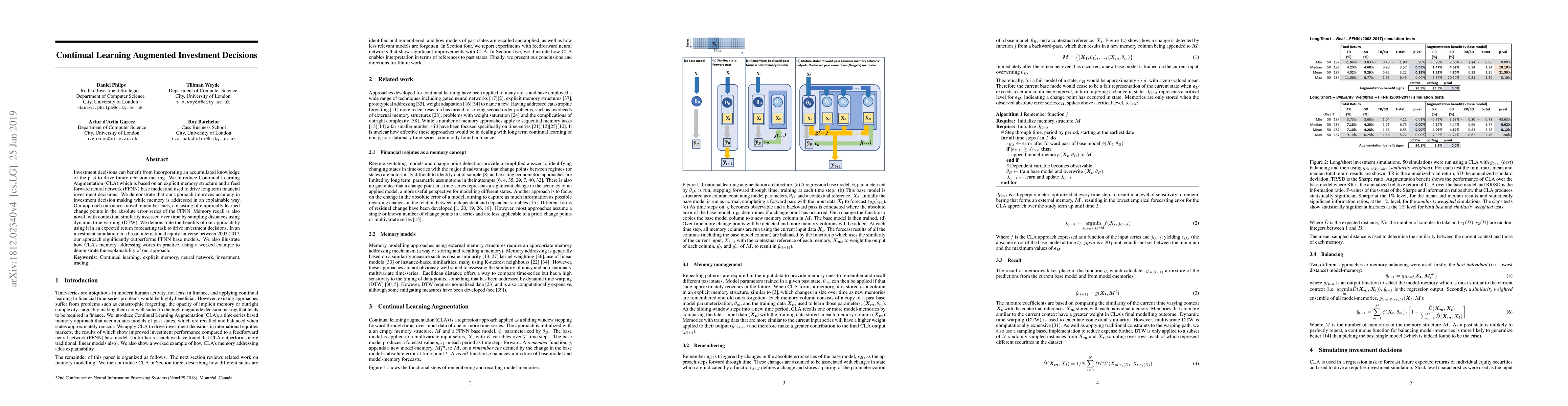 The research introduces Continual Learning Augmentation (CLA), a method that combines an explicit memory structure with a feed-forward neural network (FFNN) base model for long-term financial investment decisions. CLA identifies change points in the absolute error series of the FFNN and uses dynamic time warping (DTW) for contextual similarity assessment over time.