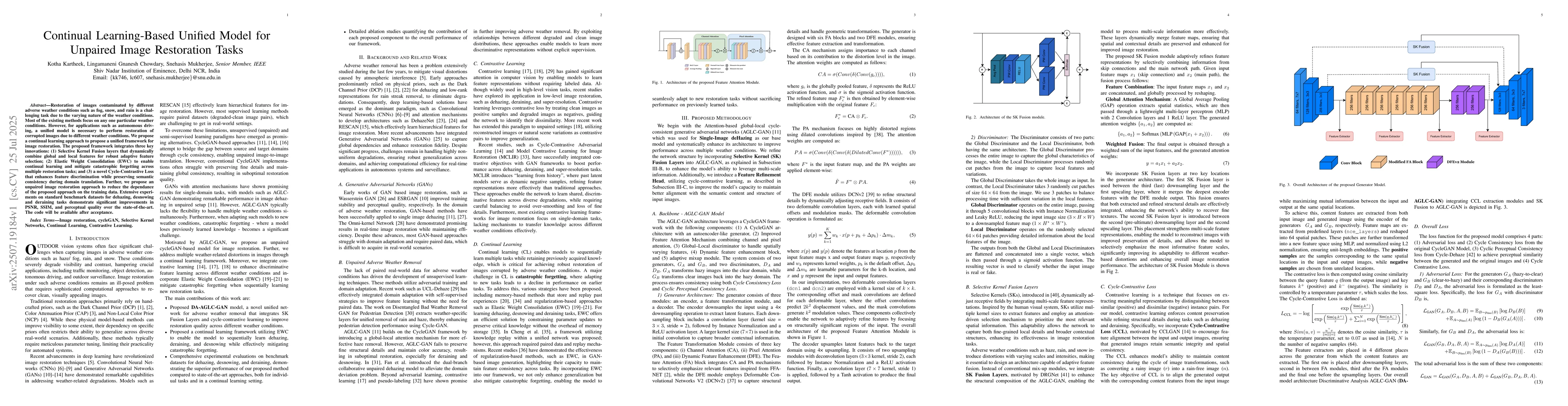 Restoration of images contaminated by different adverse weather conditions such as fog, snow, and rain is a challenging task due to the varying nature of the weather conditions. Most of the existing methods focus on any one particular weather conditions. However, for applications such as autonomous driving, a unified model is necessary to perform restoration of corrupted images due to different weather conditions. We propose a continual learning approach to propose a unified framework for image restoration. The proposed framework integrates three key innovations: (1) Selective Kernel Fusion layers that dynamically combine global and local features for robust adaptive feature selection; (2) Elastic Weight Consolidation (EWC) to enable continual learning and mitigate catastrophic forgetting across multiple restoration tasks; and (3) a novel Cycle-Contrastive Loss that enhances feature discrimination while preserving semantic consistency during domain translation. Further, we propose an unpaired image restoration approach to reduce the dependance of the proposed approach on the training data. Extensive experiments on standard benchmark datasets for dehazing, desnowing and deraining tasks demonstrate significant improvements in PSNR, SSIM, and perceptual quality over the state-of-the-art.