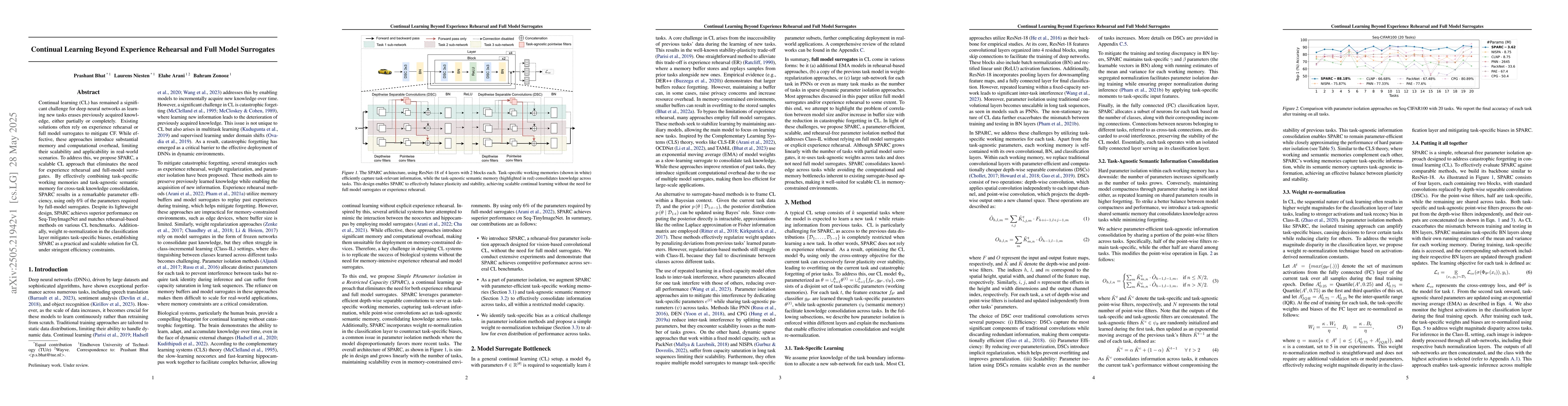 The research proposes SPARC, a continual learning approach that combines task-specific working memories and task-agnostic semantic memory for knowledge consolidation, eliminating the need for experience rehearsal and full-model surrogates.