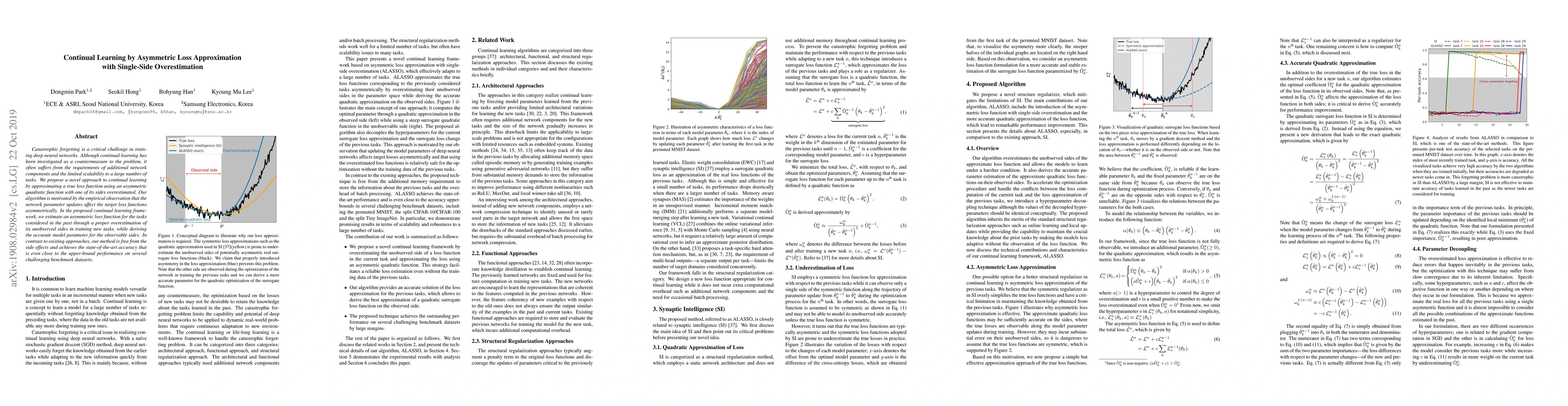 Catastrophic forgetting is a critical challenge in training deep neural networks. Although continual learning has been investigated as a countermeasure to the problem, it often suffers from the requirements of additional network components and the limited scalability to a large number of tasks. We propose a novel approach to continual learning by approximating a true loss function using an asymmetric quadratic function with one of its sides overestimated. Our algorithm is motivated by the empirical observation that the network parameter updates affect the target loss functions asymmetrically. In the proposed continual learning framework, we estimate an asymmetric loss function for the tasks considered in the past through a proper overestimation of its unobserved sides in training new tasks, while deriving the accurate model parameter for the observable sides. In contrast to existing approaches, our method is free from the side effects and achieves the state-of-the-art accuracy that is even close to the upper-bound performance on several challenging benchmark datasets.
