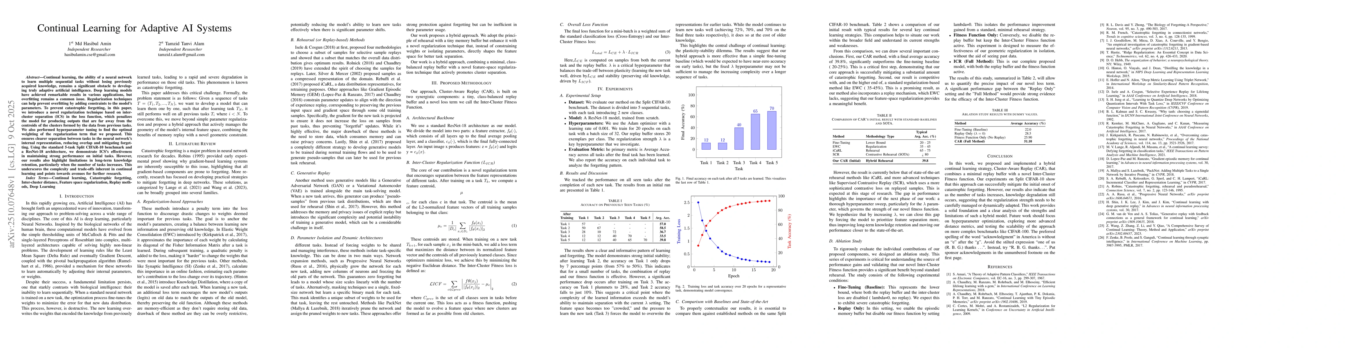 Combines minimal replay buffer with novel Inter-Cluster Fitness function, offering a new approach to continual learning that addresses catastrophic forgetting through cluster-aware regularization