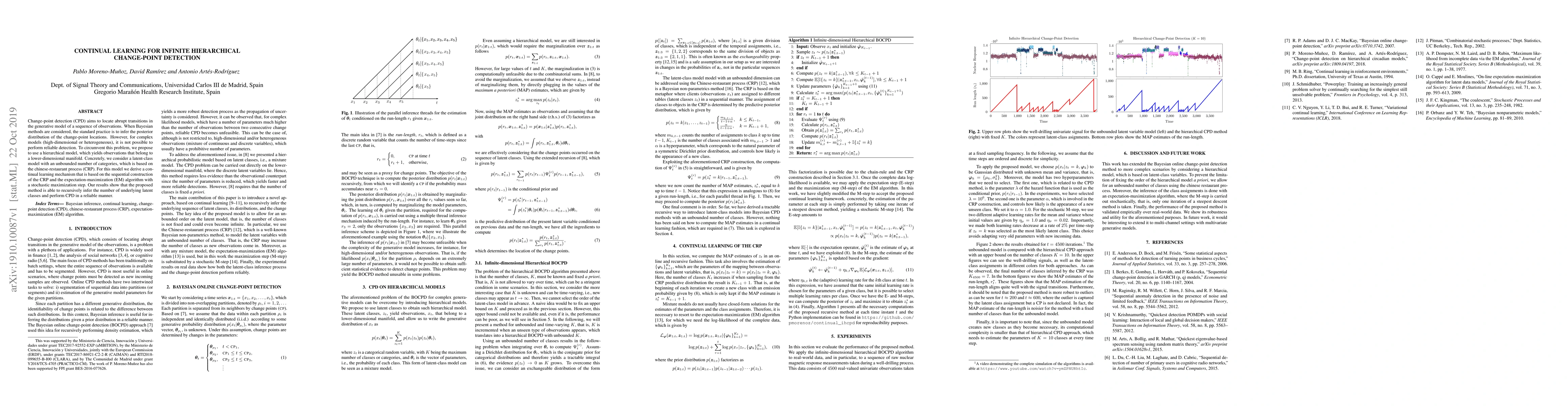 Change-point detection (CPD) aims to locate abrupt transitions in the generative model of a sequence of observations. When Bayesian methods are considered, the standard practice is to infer the posterior distribution of the change-point locations. However, for complex models (high-dimensional or heterogeneous), it is not possible to perform reliable detection. To circumvent this problem, we propose to use a hierarchical model, which yields observations that belong to a lower-dimensional manifold. Concretely, we consider a latent-class model with an unbounded number of categories, which is based on the chinese-restaurant process (CRP). For this model we derive a continual learning mechanism that is based on the sequential construction of the CRP and the expectation-maximization (EM) algorithm with a stochastic maximization step. Our results show that the proposed method is able to recursively infer the number of underlying latent classes and perform CPD in a reliable manner.