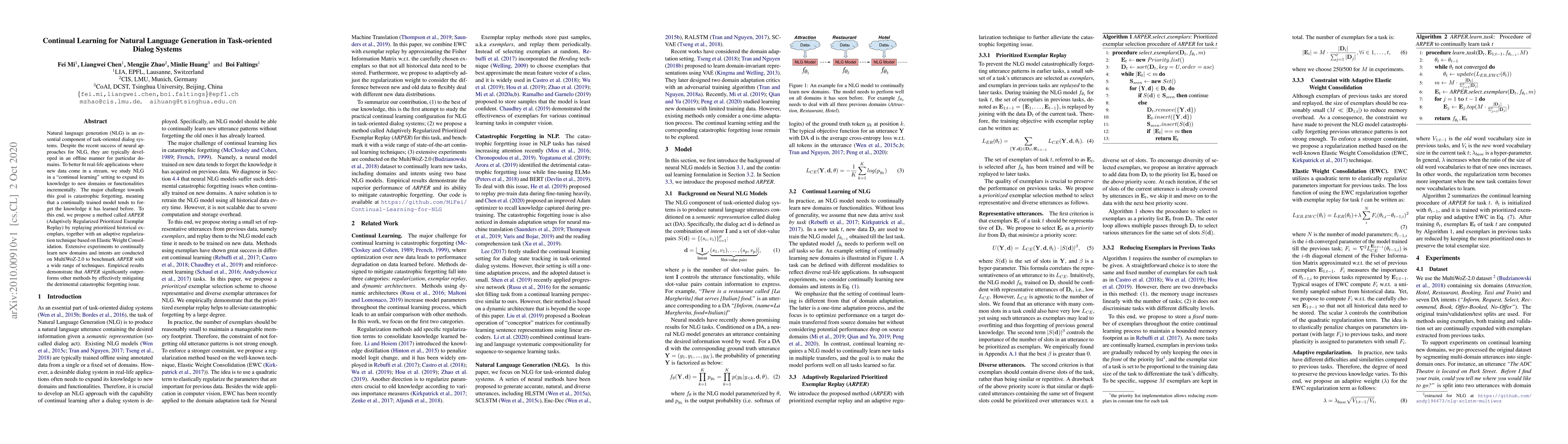This paper proposes ARPER, a method for continual learning in natural language generation for task-oriented dialog systems, addressing catastrophic forgetting by replaying prioritized historical exemplars and adaptive regularization. Experiments on MultiWoZ-2.0 show ARPER significantly outperforms other methods in mitigating forgetting.