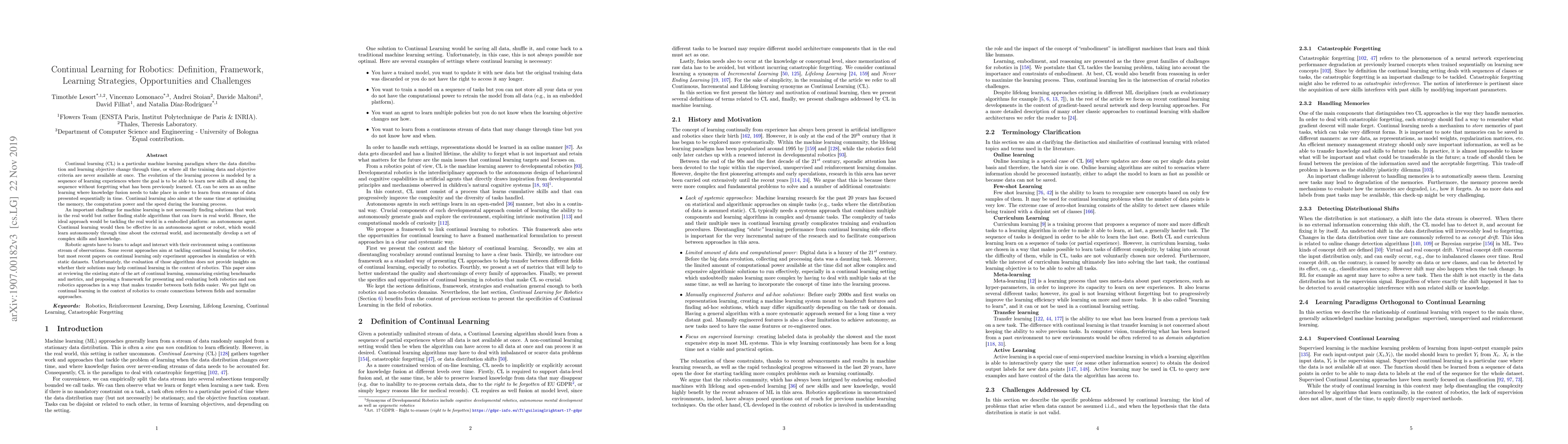 Continual learning (CL) is a particular machine learning paradigm where the data distribution and learning objective changes through time, or where all the training data and objective criteria are never available at once. The evolution of the learning process is modeled by a sequence of learning experiences where the goal is to be able to learn new skills all along the sequence without forgetting what has been previously learned. Continual learning also aims at the same time at optimizing the memory, the computation power and the speed during the learning process. An important challenge for machine learning is not necessarily finding solutions that work in the real world but rather finding stable algorithms that can learn in real world. Hence, the ideal approach would be tackling the real world in a embodied platform: an autonomous agent. Continual learning would then be effective in an autonomous agent or robot, which would learn autonomously through time about the external world, and incrementally develop a set of complex skills and knowledge. Robotic agents have to learn to adapt and interact with their environment using a continuous stream of observations. Some recent approaches aim at tackling continual learning for robotics, but most recent papers on continual learning only experiment approaches in simulation or with static datasets. Unfortunately, the evaluation of those algorithms does not provide insights on whether their solutions may help continual learning in the context of robotics. This paper aims at reviewing the existing state of the art of continual learning, summarizing existing benchmarks and metrics, and proposing a framework for presenting and evaluating both robotics and non robotics approaches in a way that makes transfer between both fields easier.