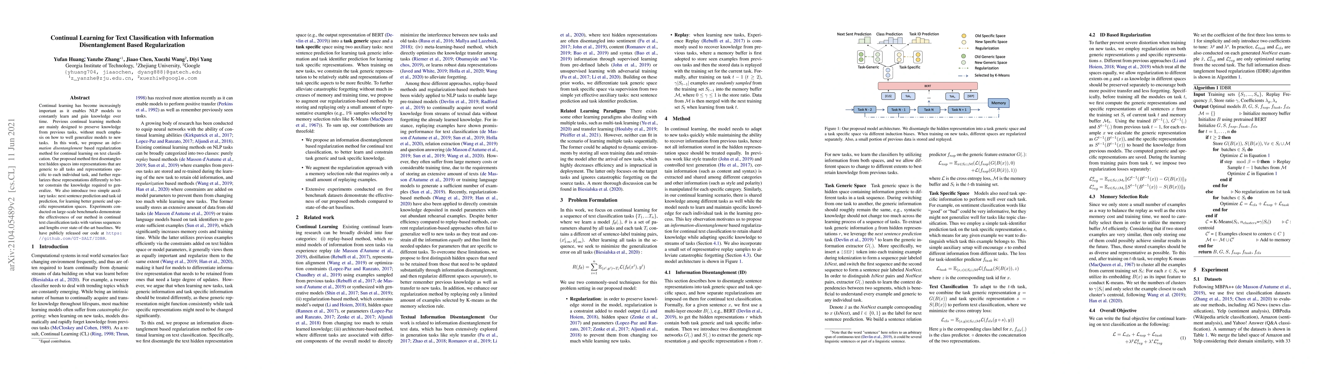 This paper proposes an information disentanglement based regularization method for continual learning in text classification, aiming to better generalize models to new tasks. The method disentangles text representations into generic and task-specific components, applying different regularization to each. Experiments show improved performance over state-of-the-art baselines on large-scale benchmarks.