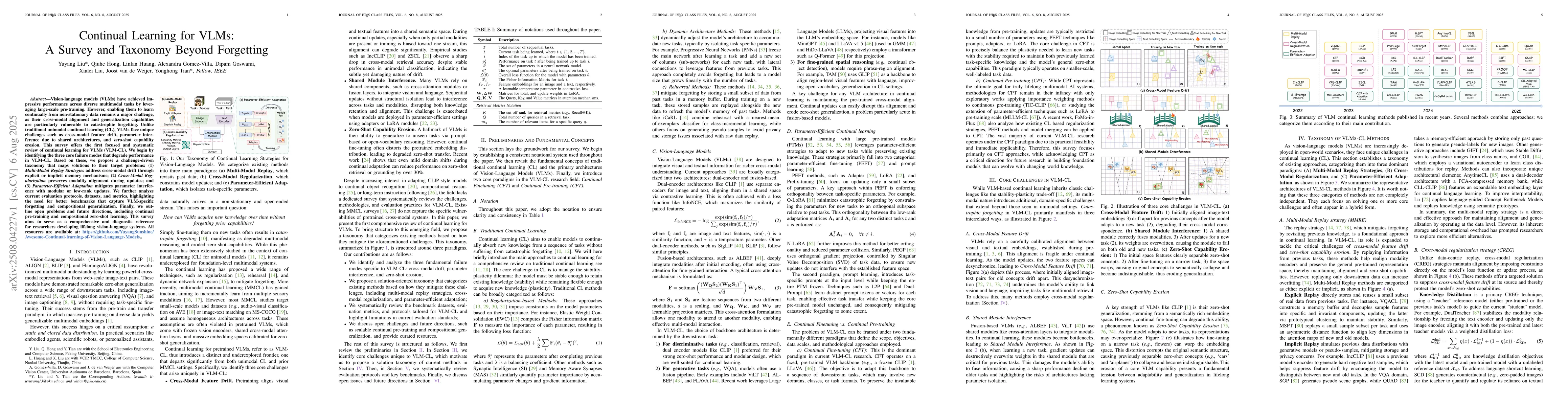 Vision-language models (VLMs) have achieved impressive performance across diverse multimodal tasks by leveraging large-scale pre-training. However, enabling them to learn continually from non-stationary data remains a major challenge, as their cross-modal alignment and generalization capabilities are particularly vulnerable to catastrophic forgetting. Unlike traditional unimodal continual learning (CL), VLMs face unique challenges such as cross-modal feature drift, parameter interference due to shared architectures, and zero-shot capability erosion. This survey offers the first focused and systematic review of continual learning for VLMs (VLM-CL). We begin by identifying the three core failure modes that degrade performance in VLM-CL. Based on these, we propose a challenge-driven taxonomy that maps solutions to their target problems: (1) \textit{Multi-Modal Replay Strategies} address cross-modal drift through explicit or implicit memory mechanisms; (2) \textit{Cross-Modal Regularization} preserves modality alignment during updates; and (3) \textit{Parameter-Efficient Adaptation} mitigates parameter interference with modular or low-rank updates. We further analyze current evaluation protocols, datasets, and metrics, highlighting the need for better benchmarks that capture VLM-specific forgetting and compositional generalization. Finally, we outline open problems and future directions, including continual pre-training and compositional zero-shot learning. This survey aims to serve as a comprehensive and diagnostic reference for researchers developing lifelong vision-language systems. All resources are available at: https://github.com/YuyangSunshine/Awesome-Continual-learning-of-Vision-Language-Models.