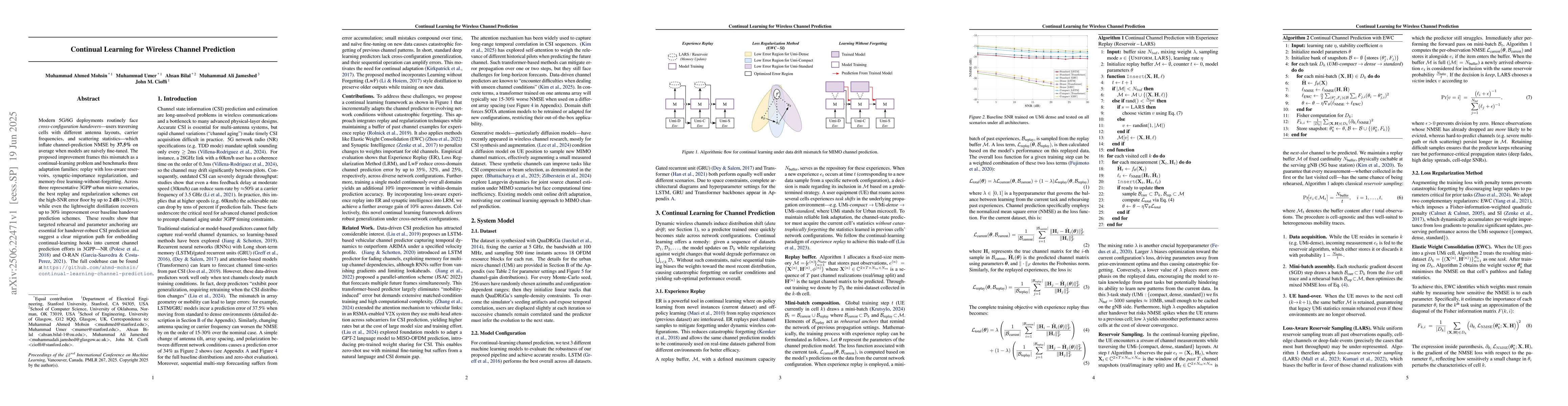 Modern 5G/6G deployments routinely face cross-configuration handovers--users traversing cells with different antenna layouts, carrier frequencies, and scattering statistics--which inflate channel-prediction NMSE by $37.5\%$ on average when models are naively fine-tuned. The proposed improvement frames this mismatch as a continual-learning problem and benchmarks three adaptation families: replay with loss-aware reservoirs, synaptic-importance regularization, and memory-free learning-without-forgetting. Across three representative 3GPP urban micro scenarios, the best replay and regularization schemes cut the high-SNR error floor by up to 2~dB ($\approx 35\%$), while even the lightweight distillation recovers up to $30\%$ improvement over baseline handover prediction schemes. These results show that targeted rehearsal and parameter anchoring are essential for handover-robust CSI prediction and suggest a clear migration path for embedding continual-learning hooks into current channel prediction efforts in 3GPP--NR and O-RAN. The full codebase can be found at https://github.com/ahmd-mohsin/continual-learning-channel-prediction.git.