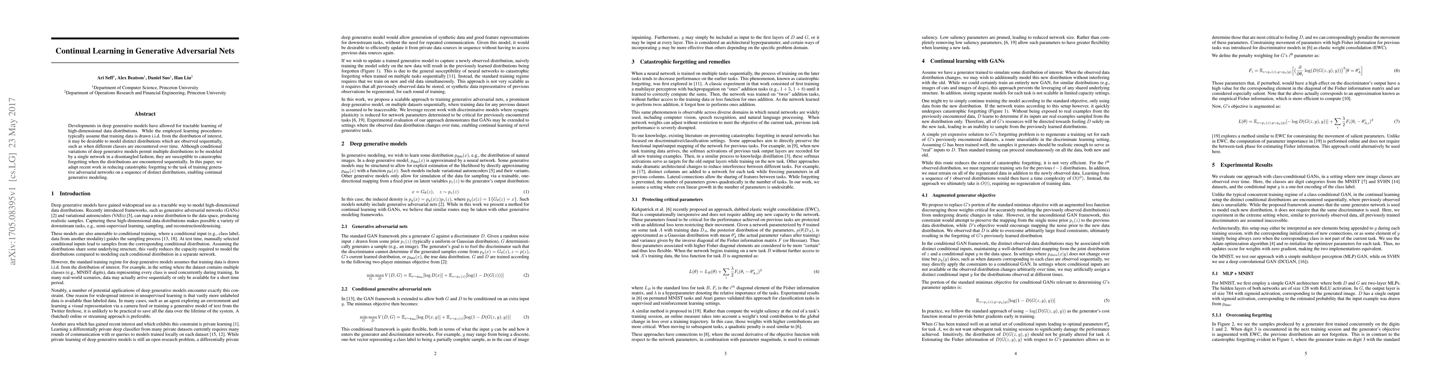 This paper proposes a method to train generative adversarial networks (GANs) to model a sequence of distinct distributions without suffering from catastrophic forgetting, enabling continual learning in generative models. The approach adapts techniques to mitigate forgetting when training data arrives sequentially.