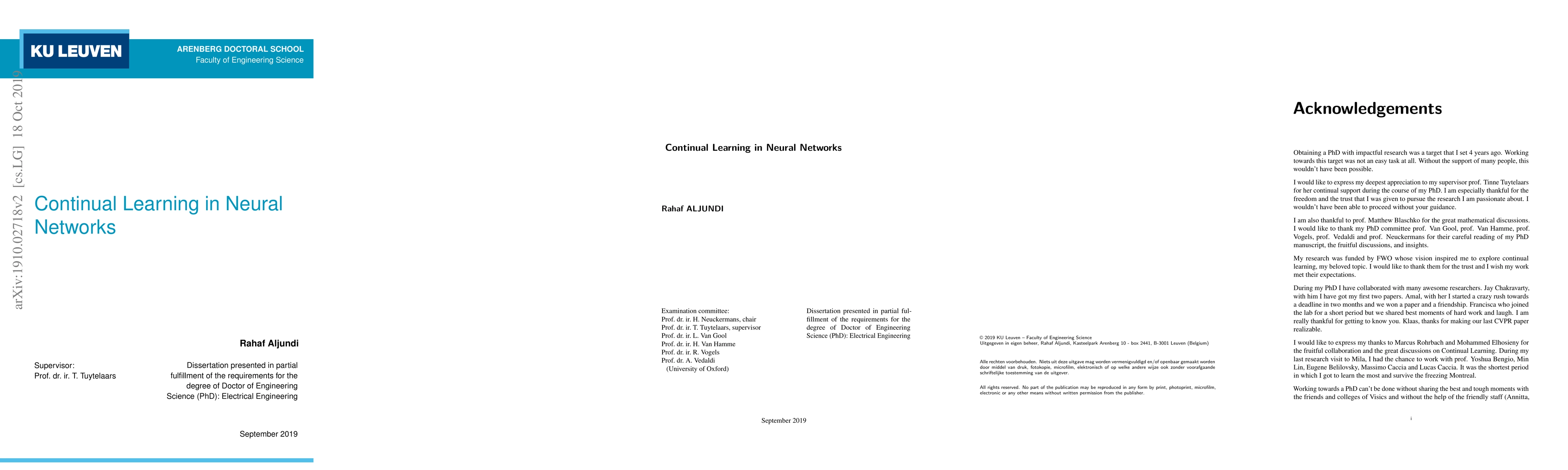 Artificial neural networks have exceeded human-level performance in accomplishing several individual tasks (e.g. voice recognition, object recognition, and video games). However, such success remains modest compared to human intelligence that can learn and perform an unlimited number of tasks. Humans' ability of learning and accumulating knowledge over their lifetime is an essential aspect of their intelligence. Continual machine learning aims at a higher level of machine intelligence through providing the artificial agents with the ability to learn online from a non-stationary and never-ending stream of data. A key component of such a never-ending learning process is to overcome the catastrophic forgetting of previously seen data, a problem that neural networks are well known to suffer from. The work described in this thesis has been dedicated to the investigation of continual learning and solutions to mitigate the forgetting phenomena in neural networks. To approach the continual learning problem, we first assume a task incremental setting where tasks are received one at a time and data from previous tasks are not stored. Since the task incremental setting can't be assumed in all continual learning scenarios, we also study the more general online continual setting. We consider an infinite stream of data drawn from a non-stationary distribution with a supervisory or self-supervisory training signal. The proposed methods in this thesis have tackled important aspects of continual learning. They were evaluated on different benchmarks and over various learning sequences. Advances in the state of the art of continual learning have been shown and challenges for bringing continual learning into application were critically identified.