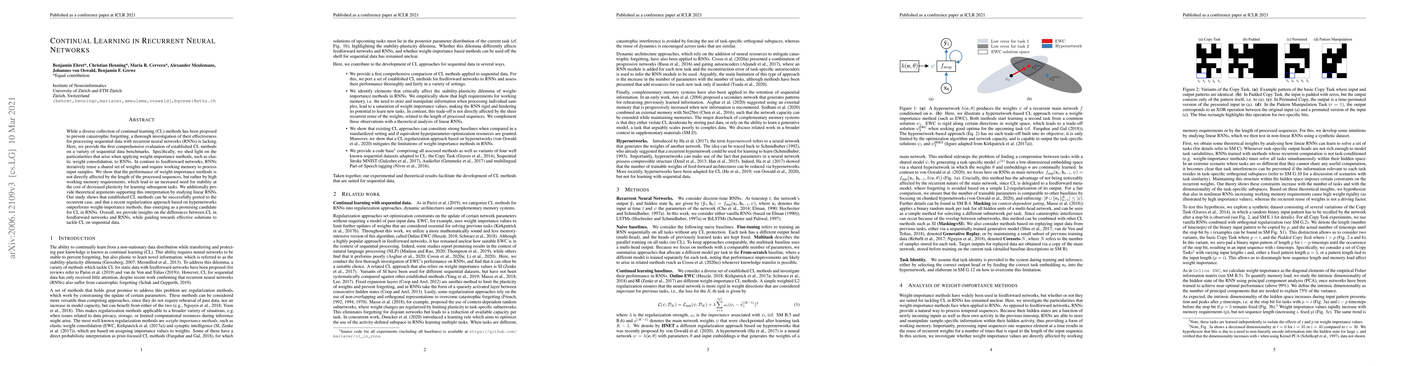 This paper evaluates the effectiveness of continual learning methods for recurrent neural networks (RNNs) to mitigate catastrophic forgetting, revealing that weight-importance methods like elastic weight consolidation face challenges due to RNNs' high working memory requirements. A regularization approach based on hypernetworks emerges as a superior solution for continual learning in RNNs.