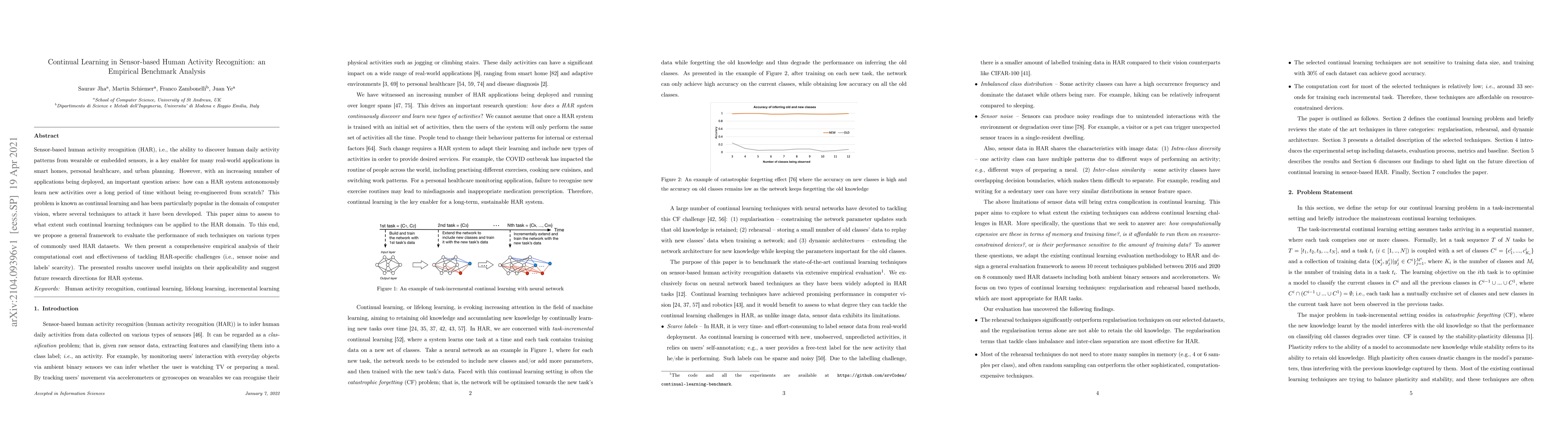 This paper evaluates the application of continual learning techniques to sensor-based human activity recognition (HAR) and proposes a framework to benchmark their performance across various datasets. The study reveals insights into the computational cost and effectiveness of these techniques in addressing HAR-specific challenges like sensor noise and label scarcity.