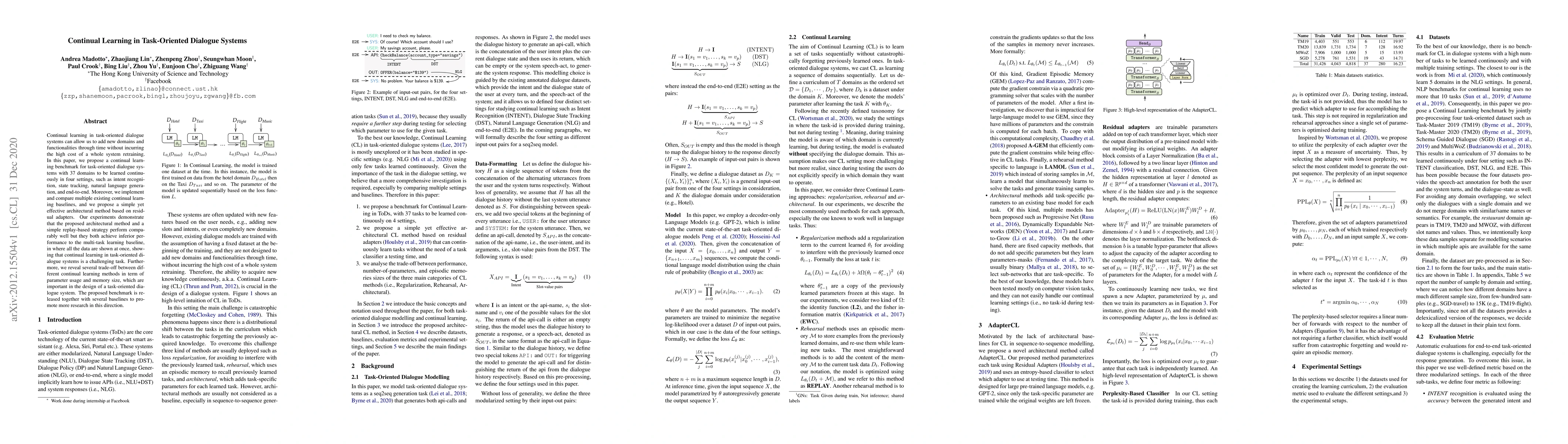 This paper proposes a continual learning benchmark for task-oriented dialogue systems, featuring 37 domains and four learning settings. It compares existing continual learning methods and introduces a residual adapter-based architecture, revealing that while effective, continual learning remains challenging compared to multi-task learning.