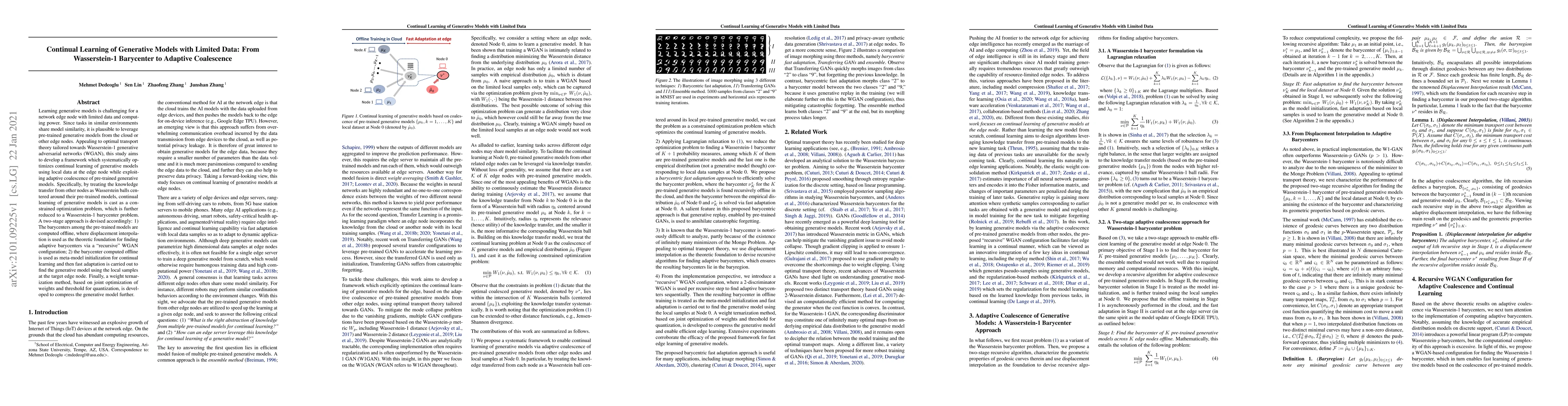 Learning generative models is challenging for a network edge node with limited data and computing power. Since tasks in similar environments share model similarity, it is plausible to leverage pre-trained generative models from the cloud or other edge nodes. Appealing to optimal transport theory tailored towards Wasserstein-1 generative adversarial networks (WGAN), this study aims to develop a framework which systematically optimizes continual learning of generative models using local data at the edge node while exploiting adaptive coalescence of pre-trained generative models. Specifically, by treating the knowledge transfer from other nodes as Wasserstein balls centered around their pre-trained models, continual learning of generative models is cast as a constrained optimization problem, which is further reduced to a Wasserstein-1 barycenter problem. A two-stage approach is devised accordingly: 1) The barycenters among the pre-trained models are computed offline, where displacement interpolation is used as the theoretic foundation for finding adaptive barycenters via a "recursive" WGAN configuration; 2) the barycenter computed offline is used as meta-model initialization for continual learning and then fast adaptation is carried out to find the generative model using the local samples at the target edge node. Finally, a weight ternarization method, based on joint optimization of weights and threshold for quantization, is developed to compress the generative model further.