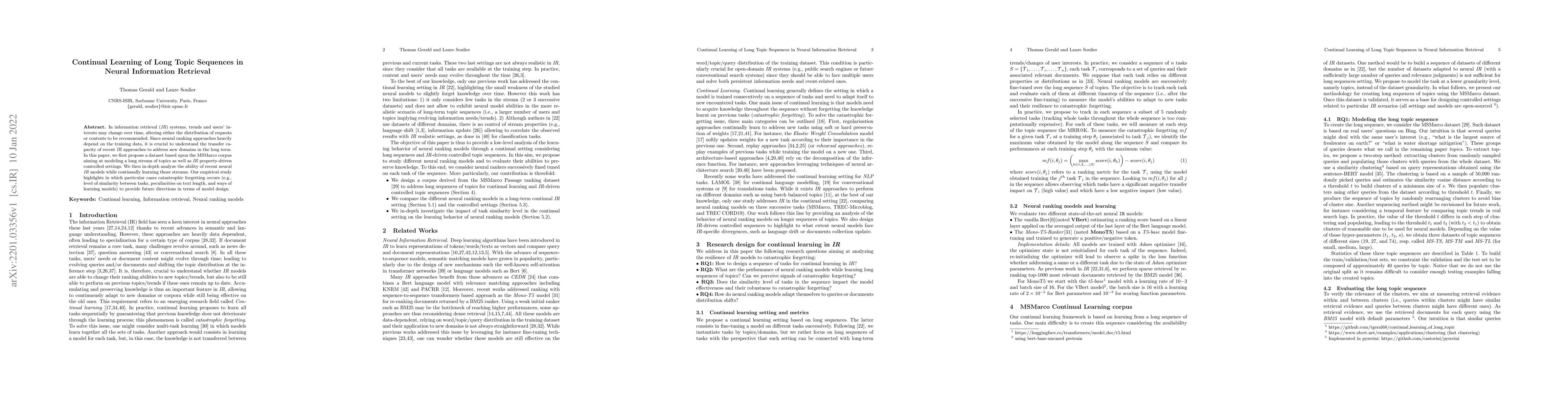 In information retrieval (IR) systems, trends and users' interests may change over time, altering either the distribution of requests or contents to be recommended. Since neural ranking approaches heavily depend on the training data, it is crucial to understand the transfer capacity of recent IR approaches to address new domains in the long term. In this paper, we first propose a dataset based upon the MSMarco corpus aiming at modeling a long stream of topics as well as IR property-driven controlled settings. We then in-depth analyze the ability of recent neural IR models while continually learning those streams. Our empirical study highlights in which particular cases catastrophic forgetting occurs (e.g., level of similarity between tasks, peculiarities on text length, and ways of learning models) to provide future directions in terms of model design.