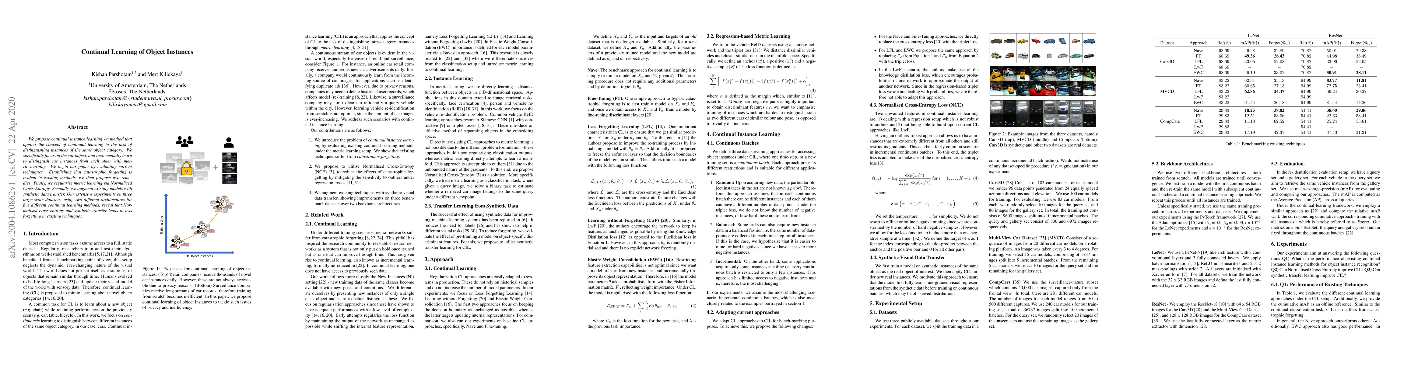 We propose continual instance learning - a method that applies the concept of continual learning to the task of distinguishing instances of the same object category. We specifically focus on the car object, and incrementally learn to distinguish car instances from each other with metric learning. We begin our paper by evaluating current techniques. Establishing that catastrophic forgetting is evident in existing methods, we then propose two remedies. Firstly, we regularise metric learning via Normalised Cross-Entropy. Secondly, we augment existing models with synthetic data transfer. Our extensive experiments on three large-scale datasets, using two different architectures for five different continual learning methods, reveal that Normalised cross-entropy and synthetic transfer leads to less forgetting in existing techniques.