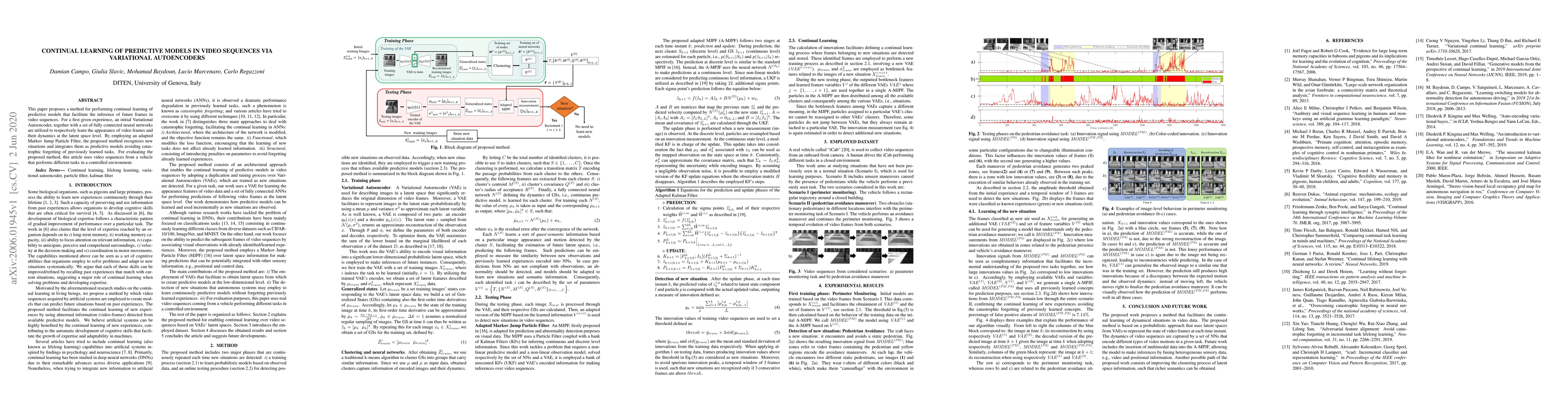 This paper introduces a continual learning method for predictive video models using Variational Autoencoders and a Markov Jump Particle Filter to avoid catastrophic forgetting, evaluated on vehicle task sequences. The approach integrates new situations into predictive models without losing previously learned information.