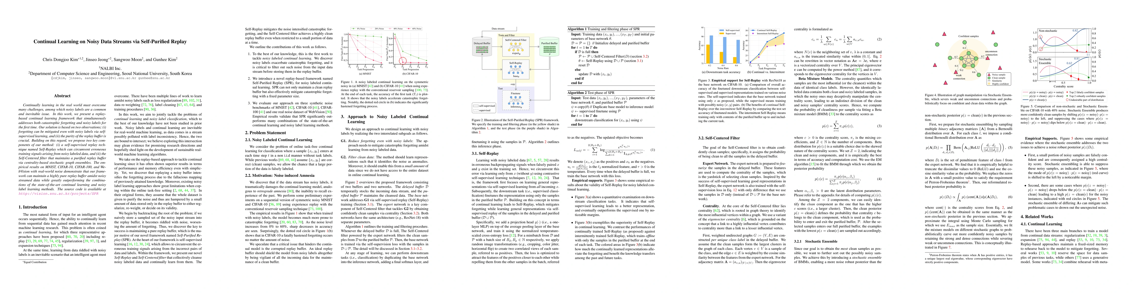 This paper proposes a continual learning framework for noisy data streams that tackles both catastrophic forgetting and noisy labels using a self-supervised replay technique and a Self-Centered filter to maintain a pure replay buffer. Empirical results show superior performance on multiple datasets compared to state-of-the-art methods.