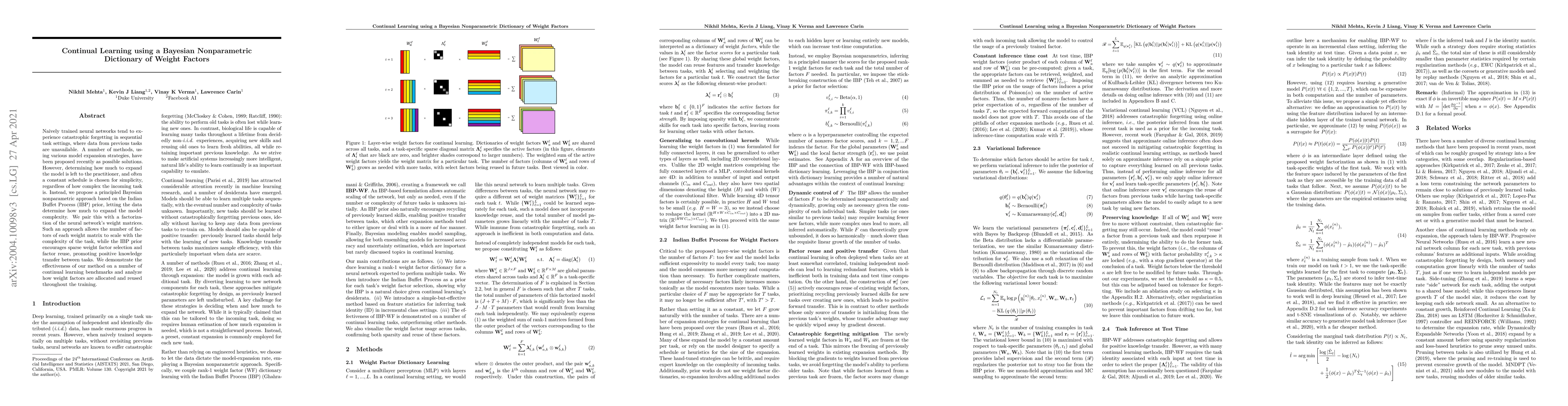 Naively trained neural networks tend to experience catastrophic forgetting in sequential task settings, where data from previous tasks are unavailable. A number of methods, using various model expansion strategies, have been proposed recently as possible solutions. However, determining how much to expand the model is left to the practitioner, and often a constant schedule is chosen for simplicity, regardless of how complex the incoming task is. Instead, we propose a principled Bayesian nonparametric approach based on the Indian Buffet Process (IBP) prior, letting the data determine how much to expand the model complexity. We pair this with a factorization of the neural network's weight matrices. Such an approach allows the number of factors of each weight matrix to scale with the complexity of the task, while the IBP prior encourages sparse weight factor selection and factor reuse, promoting positive knowledge transfer between tasks. We demonstrate the effectiveness of our method on a number of continual learning benchmarks and analyze how weight factors are allocated and reused throughout the training.